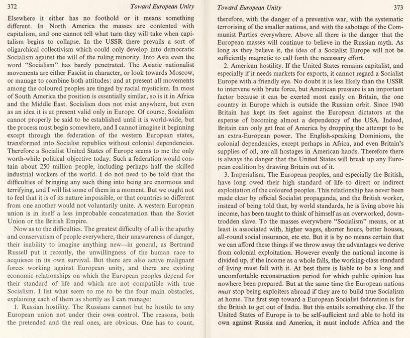 Imperialism. The European peoples, and especially the British, have long owed their high standard of life to direct or indirect exploitation of the coloured peoples. This relationship has never been made clear by official Socialist propaganda, and the British worker, instead of being told that, by world standards, he is living above his income, has been taught to think of himself as an overworked, down-trodden slave. To the masses everywhere βSocialismβ means, or at least is associated with, higher wages, shorter hours, better houses, all-round social insurance, etc. etc. But it is by no means certain that we can afford these things if we throw away the advantages we derive from colonial exploitation. However evenly the national income is divided up, if the income as a whole falls, the working-class standard of living must fall with it. At best there is liable to be a long and uncomfortable reconstruction period for which public opinion has nowhere been prepared.