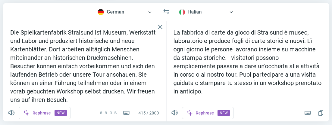 Screenshot che mostra il testo d'esempio tradotto da Reverso. Originale tedesco: "Die Spielkartenfabrik Stralsund ist Museum, Werkstatt und Labor und produziert historische und neue Kartenblätter. Dort arbeiten alltäglich Menschen miteinander an historischen Druckmaschinen. Besucher können einfach vorbeikommen und sich den laufenden Betrieb oder unsere Tour anschauen. Sie können an einer Führung teilnehmen oder in einem vorab gebuchten Workshop selbst drucken. Wir freuen uns auf ihren Besuch." Traduzione: "La fabbrica di carte da gioco di Stralsund è museo, laboratorio e produce fogli di carte storici e nuovi. Lì ogni giorno le persone lavorano insieme su macchine da stampa storiche. I visitatori possono semplicemente passare a dare un'occhiata alle attività in corso o al nostro tour. Puoi partecipare a una visita guidata o stampare tu stesso in un workshop prenotato in anticipo."