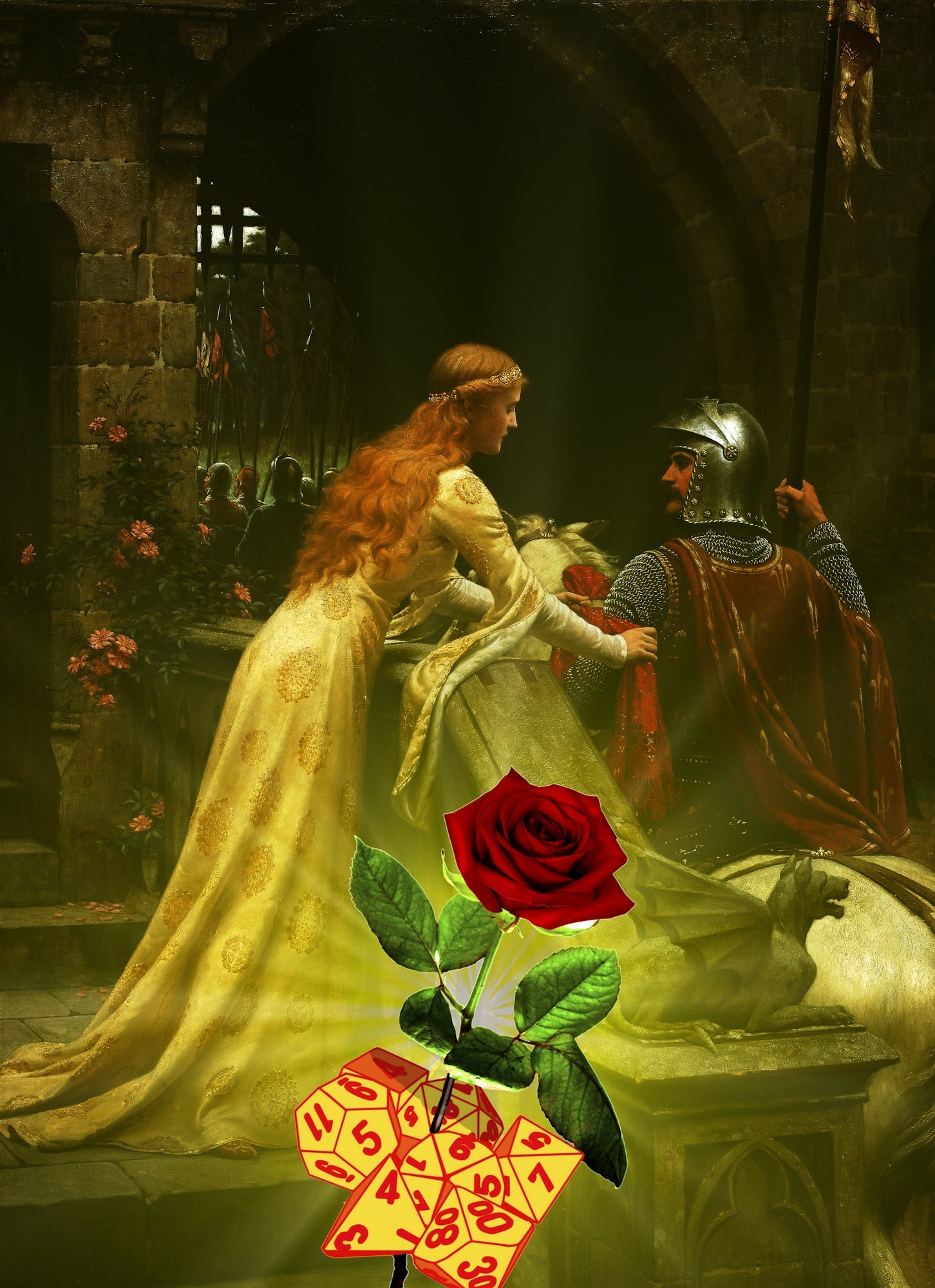 God Speed by Edmund Blair Leighton (1900). Amb una rosa i uns daus afegits. Con una rosa y unos dados añadidos. With a rose and some dice added.
