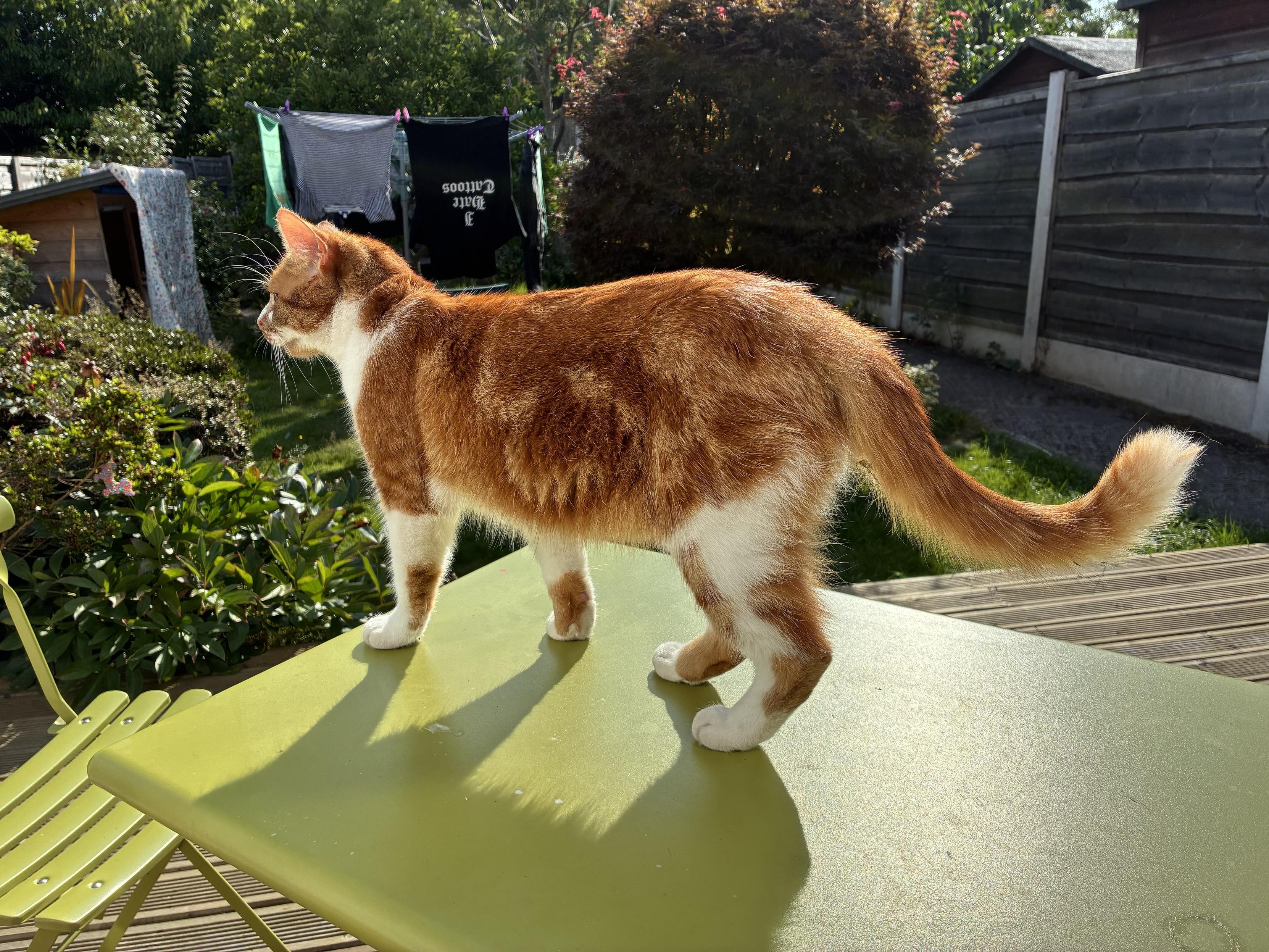 A ginger cat stands on a green table in a garden, looking to the side. In the background, there are laundry items hanging on a line and greenery surrounding the area. A chair is positioned nearby.