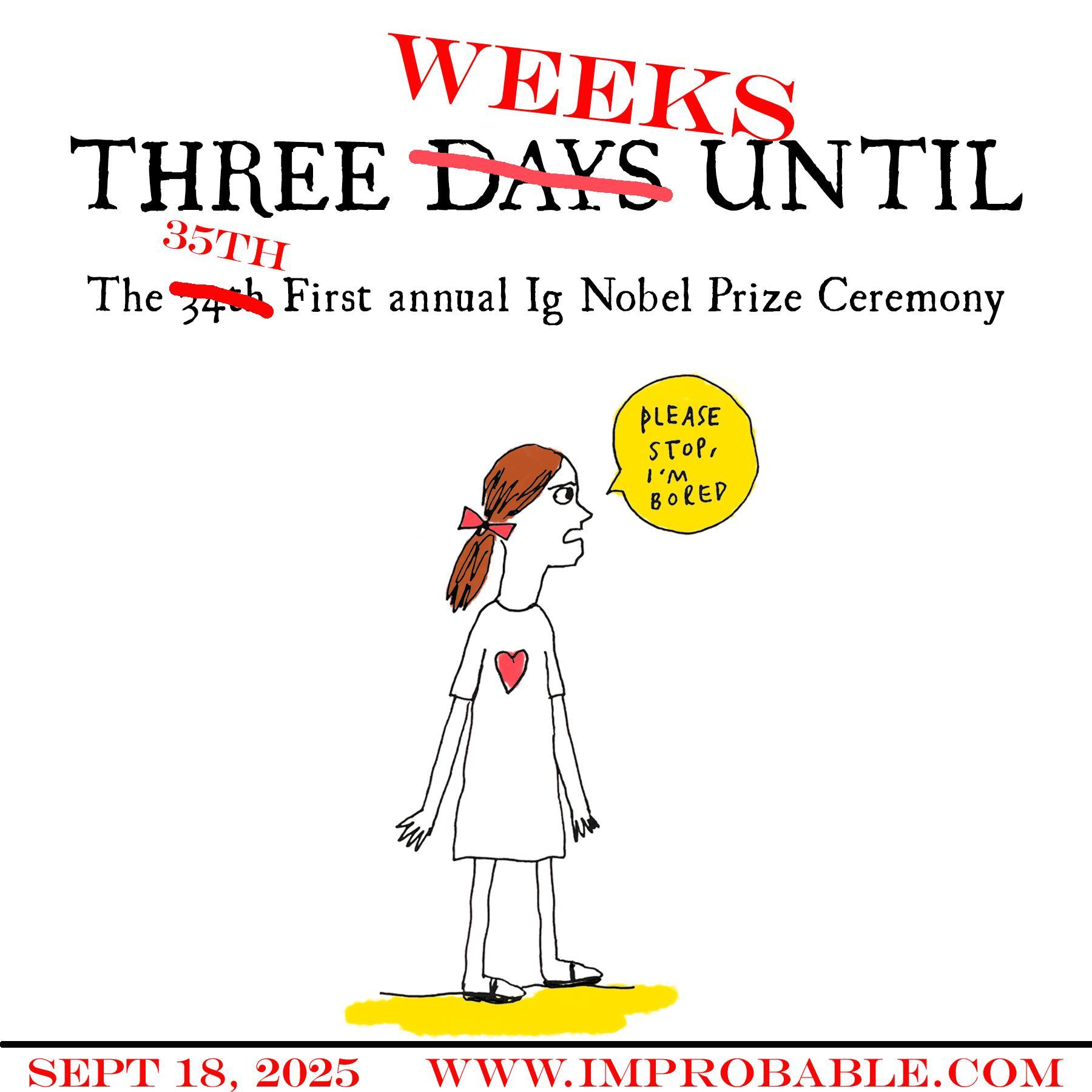 TRE SETTIMANE ALLA 35° cerimonia annuale del Premio Ig Nobel. PER FAVORE, FERMATEVI, MI ANNOIO 18 SETTEMBRE 2025 WWW.IMPROBABLE.COM