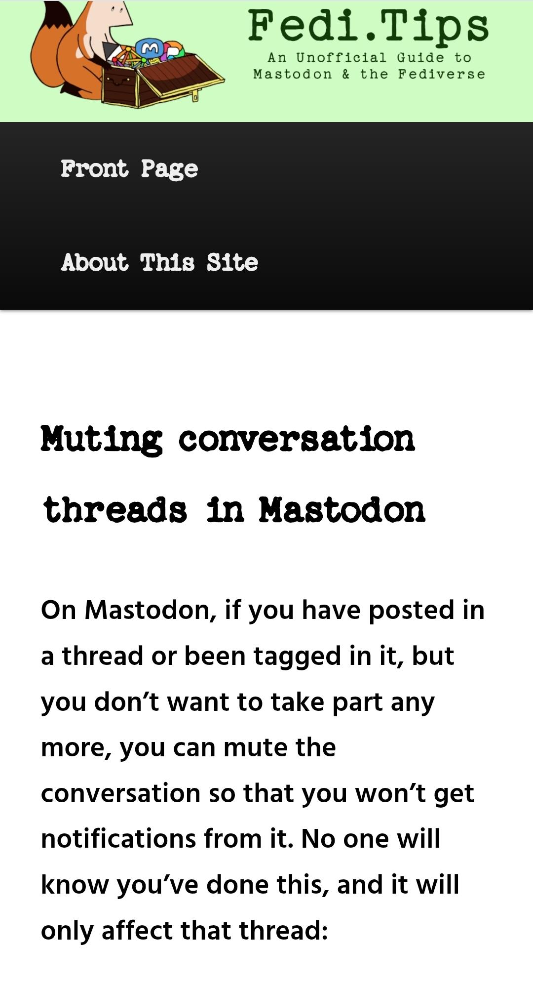 A screenshot from Fedi.Tips: Muting conversation threads in Mastodon On Mastodon, if you have posted in a thread or been tagged in it, but you donβt want to take part any more, you can mute the conversation so that you wonβt get notifications from it. No one will know youβve done this, and it will only affect that thread: