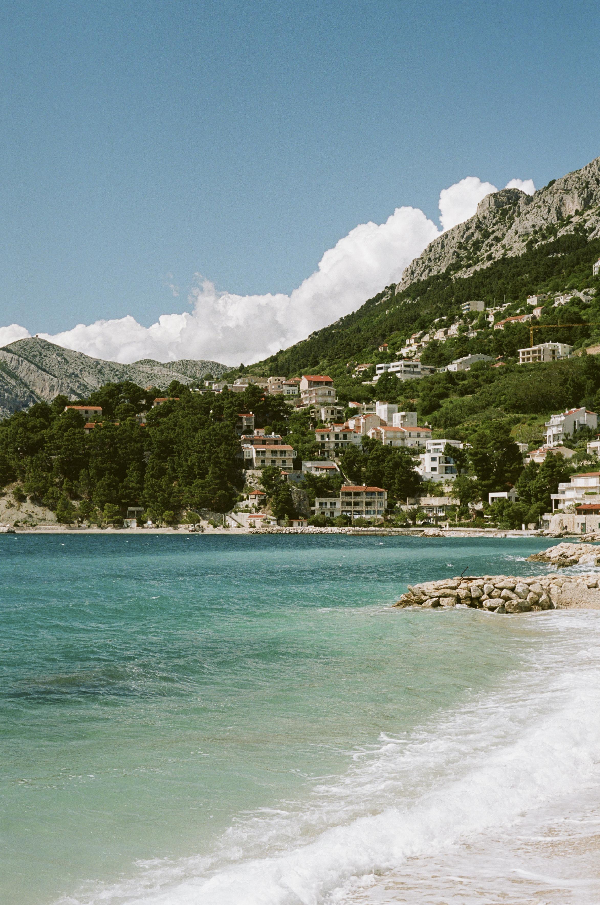 Turqoise sea, foaming as it approaches the coast. A village with red roofs, enroaching on a mountain. More mountains behind, with low set clouds barely making it over the mountains. Above, a bright blue sky.