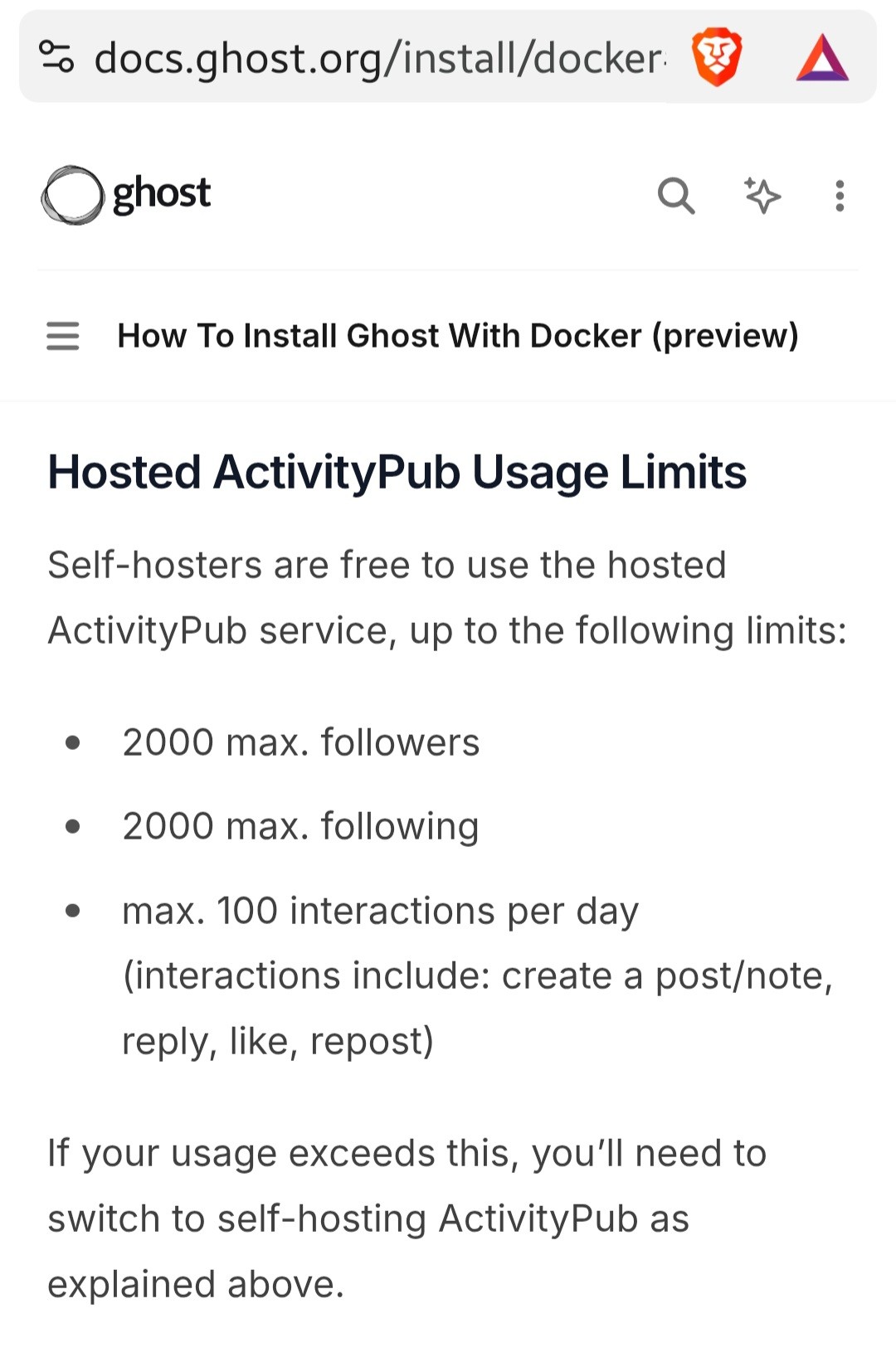 Screenshot parziale della pagina web di installazione piattaforma di blog Ghost, con il segiente testo: url: docs.ghost.org/install/docker. Ghost How To Install Ghost With Docker (preview) Hosted ActivityPub Usage Limits. Self-hosters are free to use the hosted ActivityPub service, up to the following limits: 2000 max. followers 2000 max. following max. 100 interactions per day (interactions include: create a post/note, reply, like, repost) If your usage exceeds this, you'll need to switch to self-hosting ActivityPub as explained above.