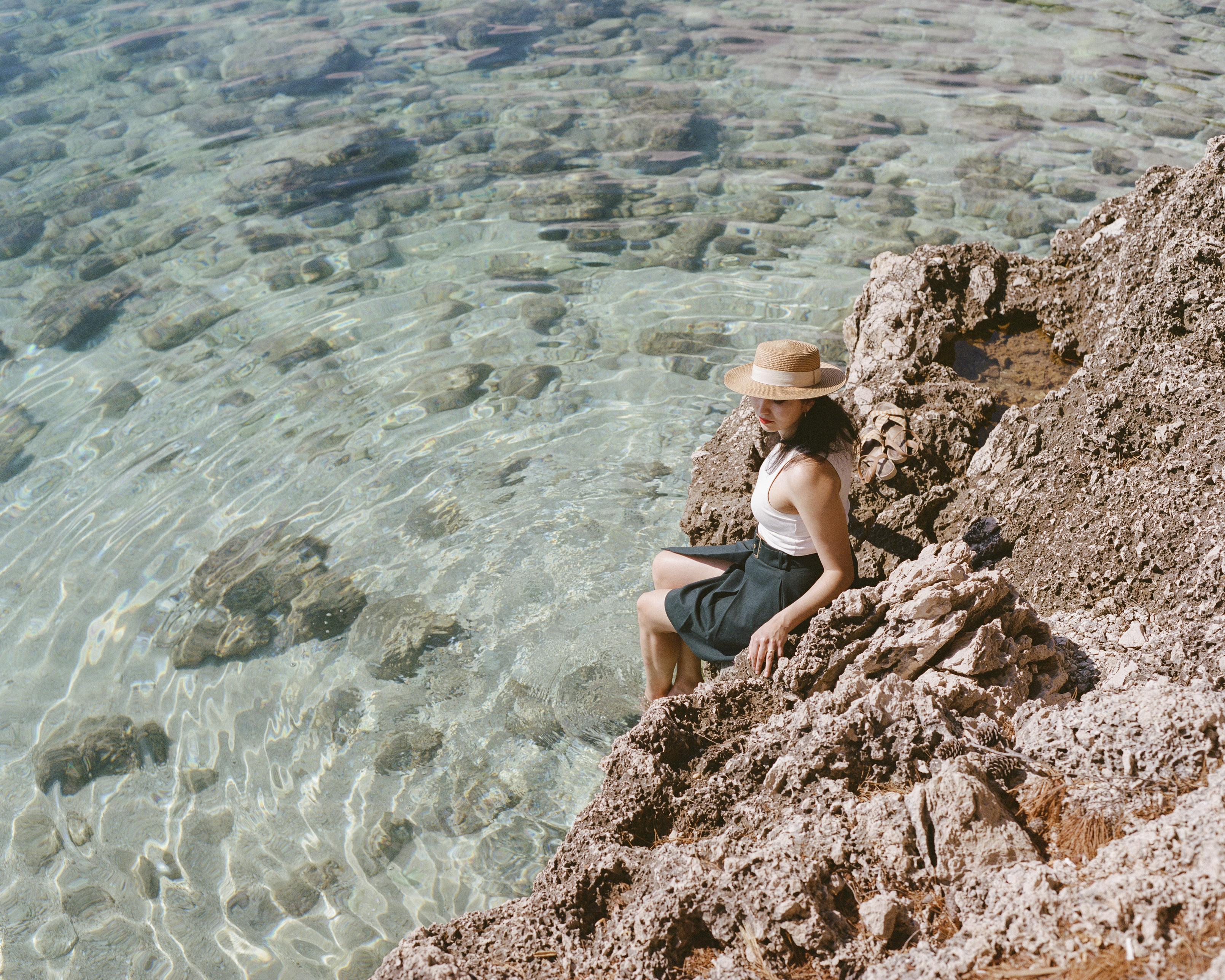 A woman dressed in a green skirt, white top and a straw hat is sitting on a rock formation on the coast with her legs in the water. The water is light blue and ripples are eminating from her legs through the whole frame.