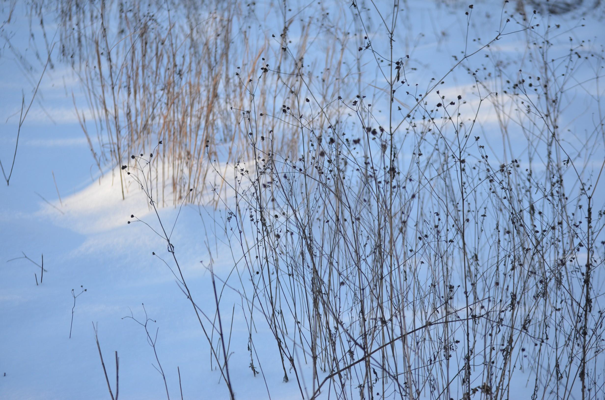 A photo of wild plants withstanding the snow one winter's day. The light is coming from the east and dappled kissing the pristine snow. The plants are dry, thin stalks with the remains of seed heads and old blossoms, now turned black and forming little constellations with their soft silhouettes. Those plants that are in the soft sunlight reveal a sandy brown hue to their stalks. The winter image feels still and quiet, as it was.