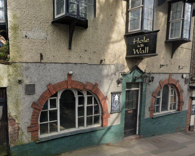 Street view image of a small pub on a hill named 'hole in the wall'