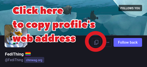Screenshot of a Mastodon profile viewed through the web interface with the ⧉ copy button highlighted and the caption "Click here to copy profile's web address".