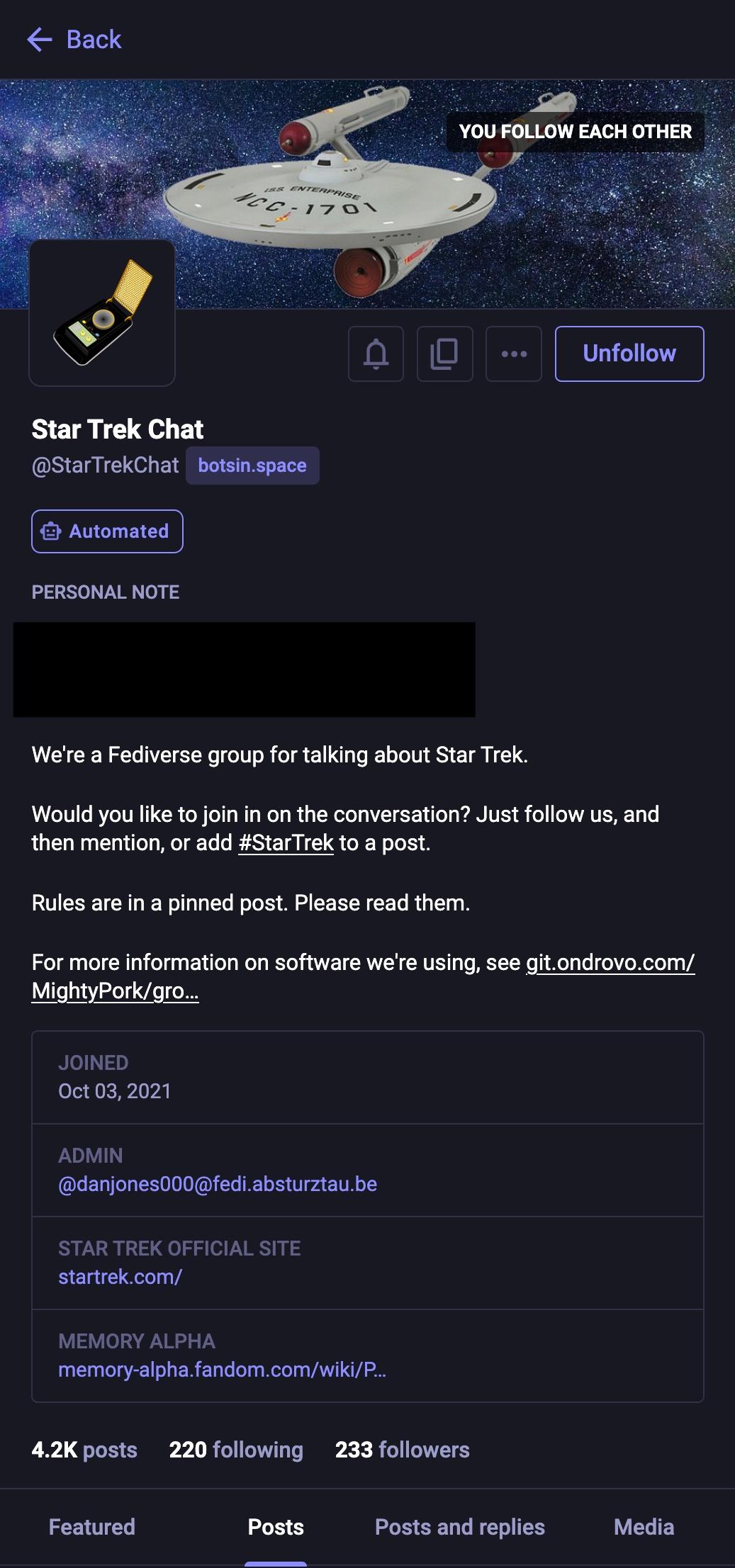 screenshot of a profile page: Star Trek Chat @StarTrekChat botsin.space We're a Fediverse group for talking about Star Trek. Would you like to join in on the conversation? Just follow us, and then mention, or add #StarTrek to a post. Rules are in a pinned post. Please read them. For more information on software we're using, see https://git.ondrovo.com/MightyPork/group-actor JOINED Oct 03, 2021 ADMIN @danjones000@fedi.absturztau.be STAR TREK OFFICIAL SITE startrek.com/ MEMORY ALPHA memory-alpha.fandom.com/wiki/P... 4.2K posts 220 following 233 followers