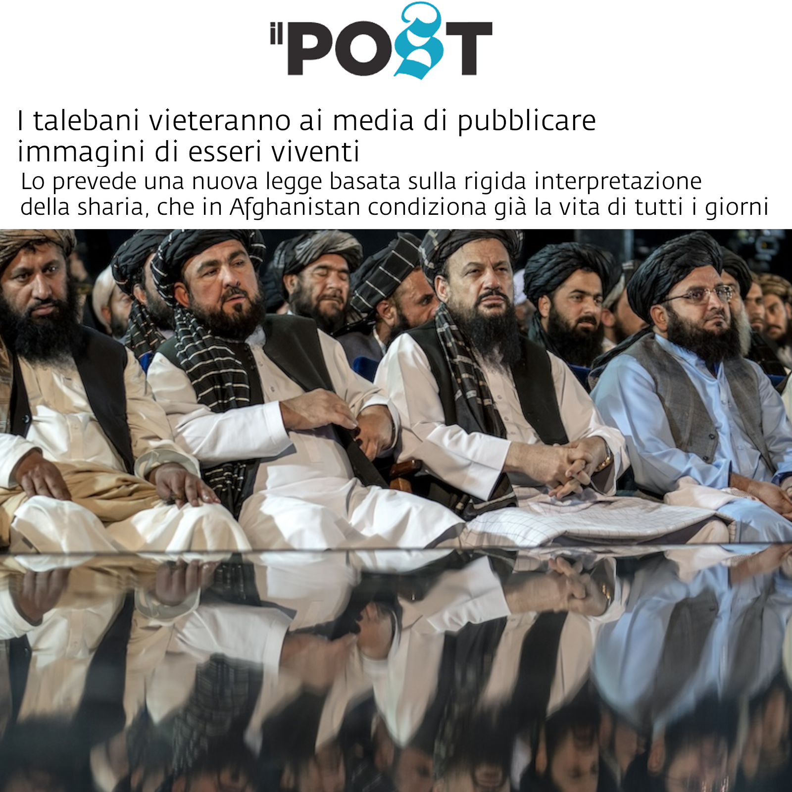 Testata: Il Post Titolo: I talebani vieteranno ai media di pubblicare immagini di esseri viventi. Sottotitolo: Lo prevede una nuova legge basata sulla rigida interpretazione della sharia, che in Afghanistan condiziona già la vita di tutti i giorni. Immagine: esponenti dei talebani in riunione.