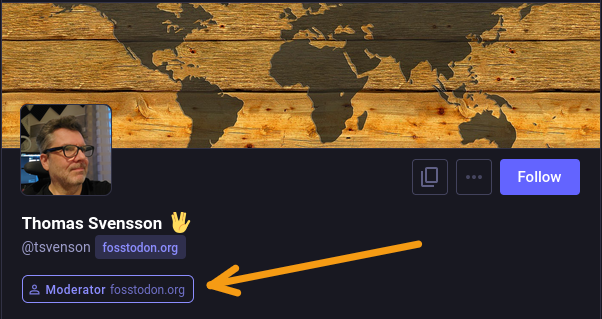The profile page for tsvenson with an arrow pointing to the badge that shows he is a moderator on Fosstodon.