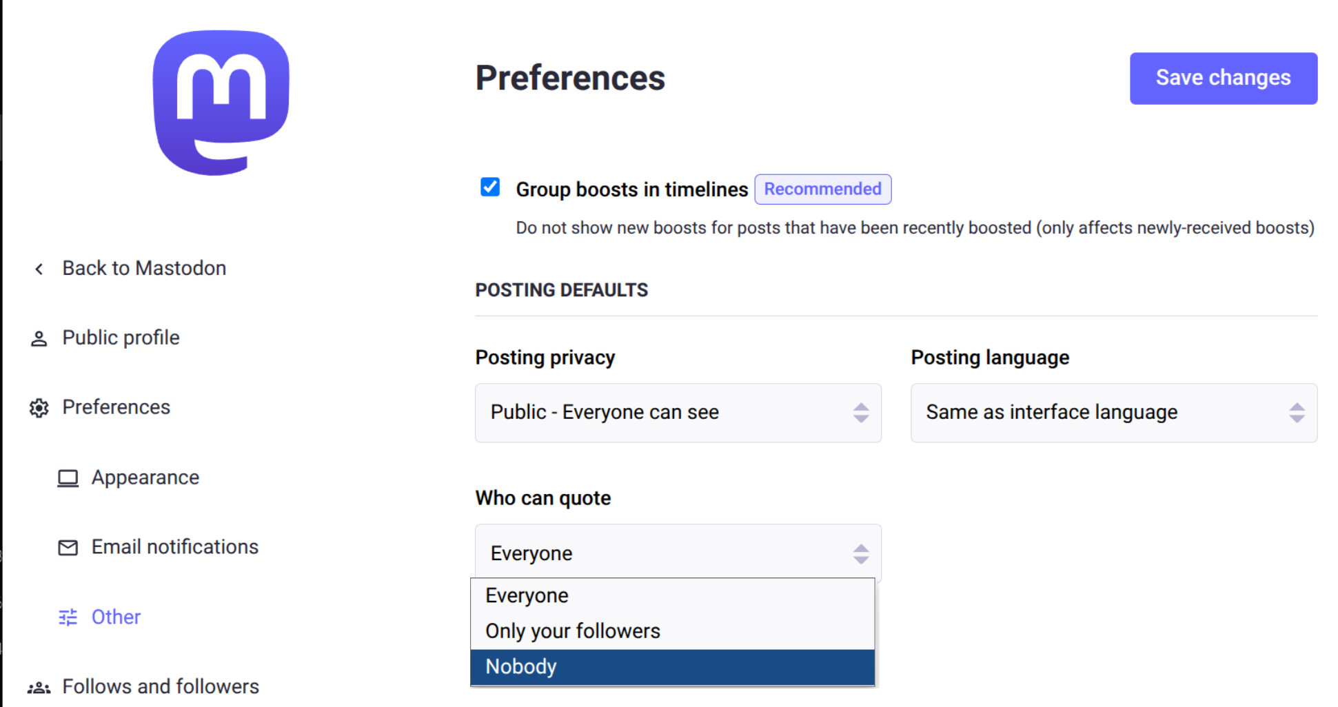 A screenshot showing the Preferences -> Other -> Who can quote option in Mastodon 4.4
