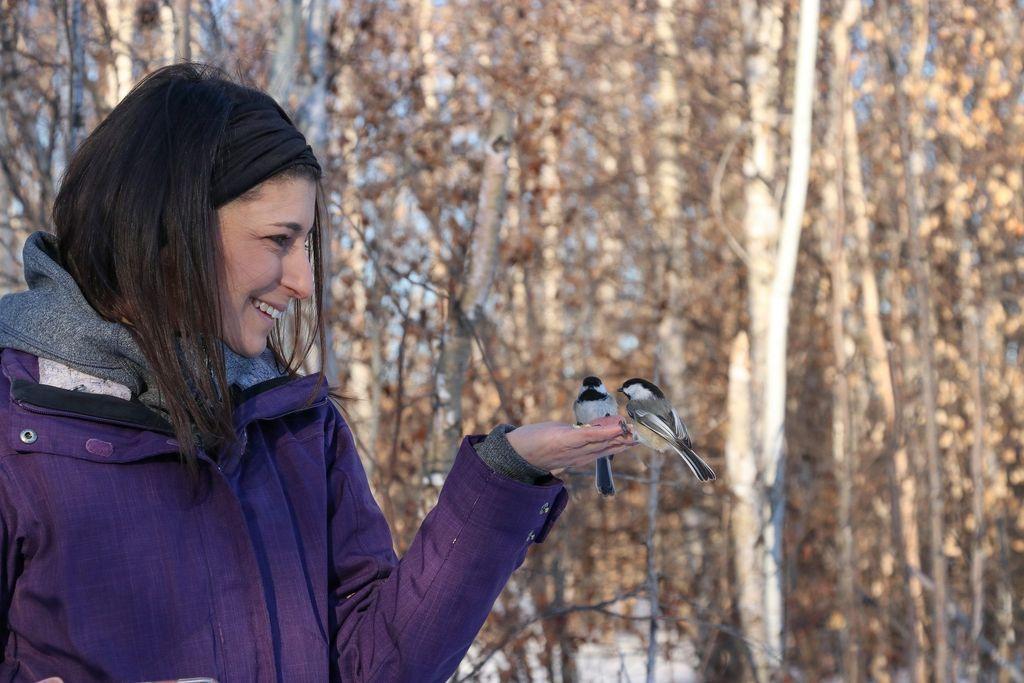 Photo of myself in early winter with hand slightly outstretched with some wild birdseed in my palm. Two chickadees are perched on my finger tips, and I am smiling in delight. A mix of birch and aspen with brown leaves are in soft focus in the background.
