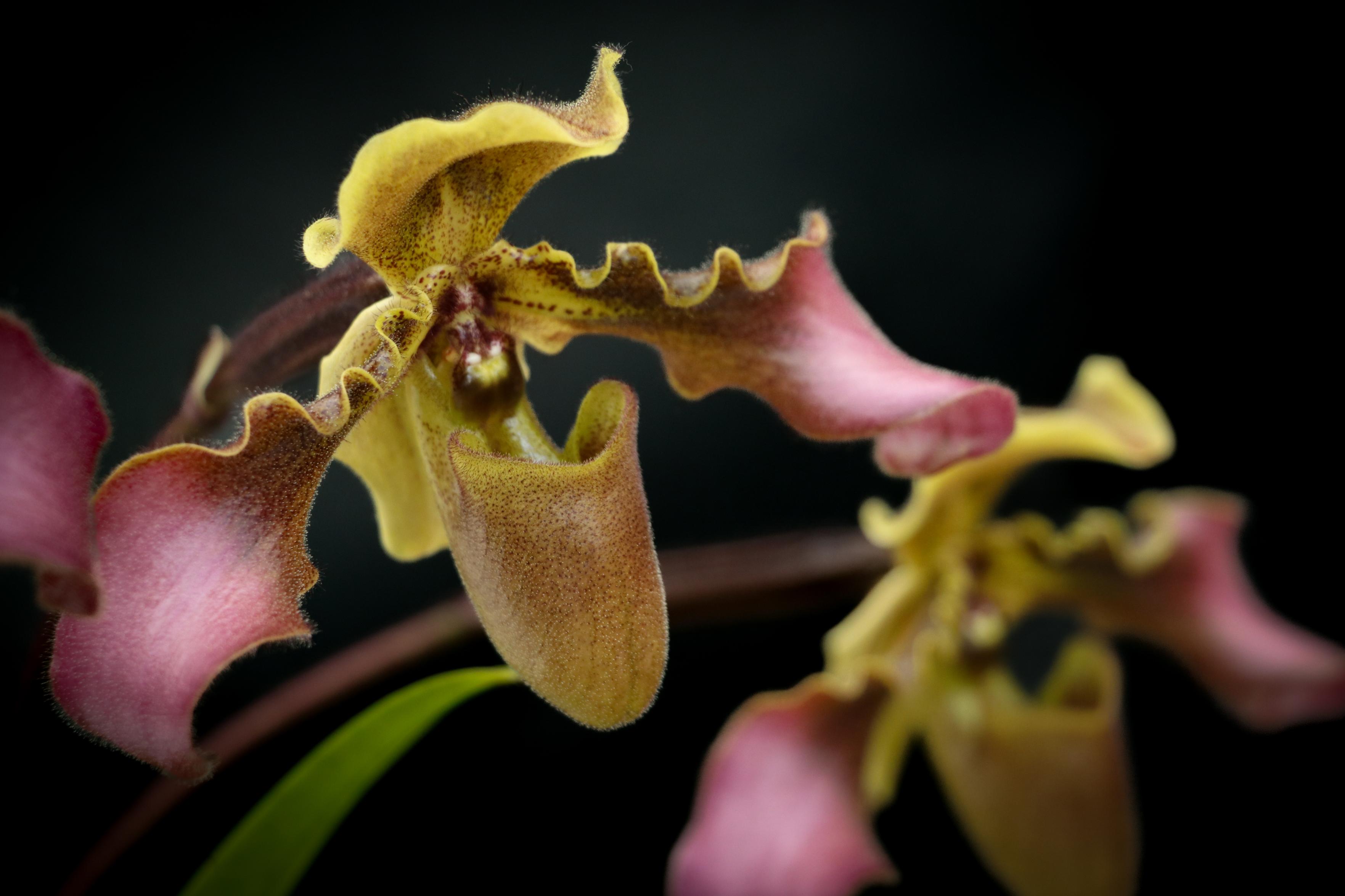 Macro photo of a yellow and burgundy orchid with ripply side-petals and a smattering of "freckles." A second, softly blurred orchid of the same kind is in the background.