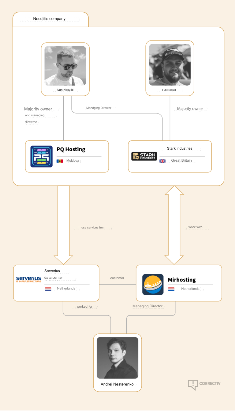 An organization chart published by the news publication correctiv.org shows photos of the Neculiti brothers and their connections to MIRhosting in the Netherlands.