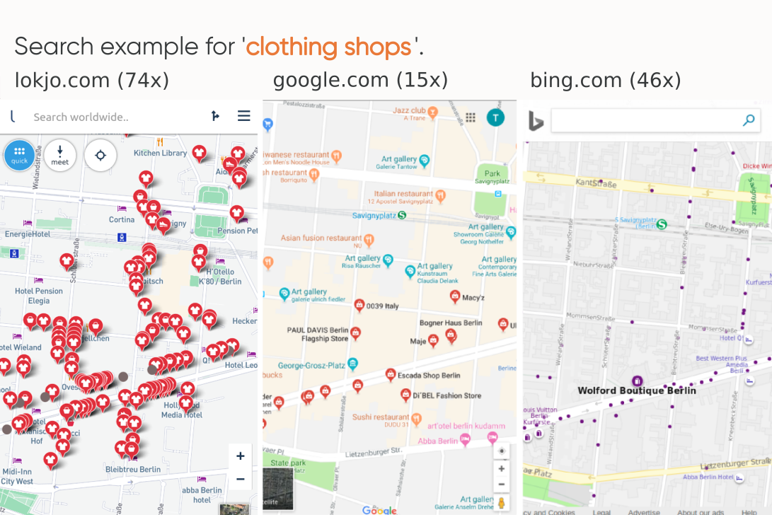 example of searchresults from Lokjo, google and Bing, where Lokjo shows all results (74) regardless of zoom level, and google shows only 15, and bing only 46 as non-clickable dots.