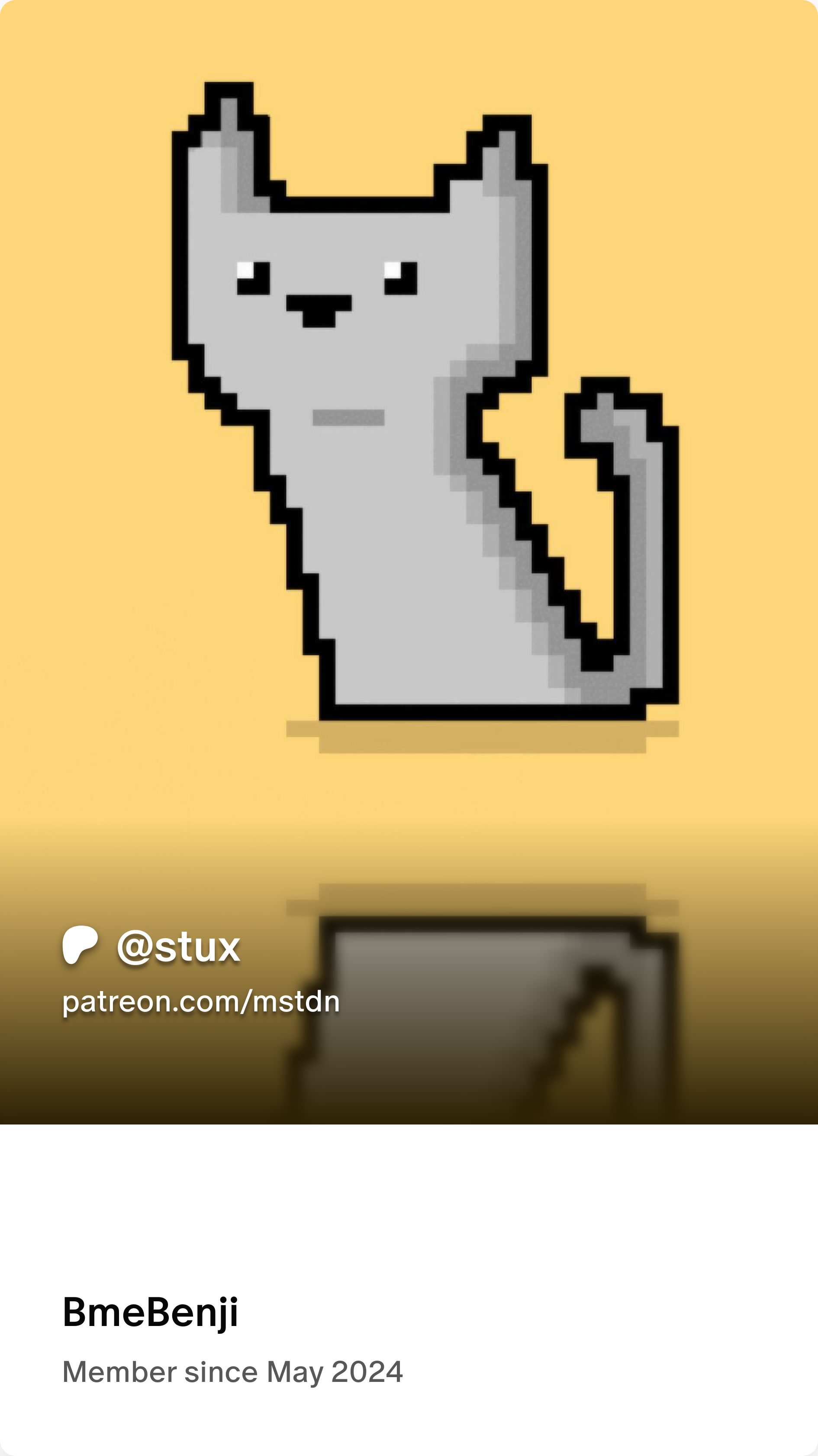 Mstdn.social/pixey.org supporter badge, acquired by donating via Patreon to the instance admin Stux@mstdn Pictured within is a pixelated cat with a quaint smiling face