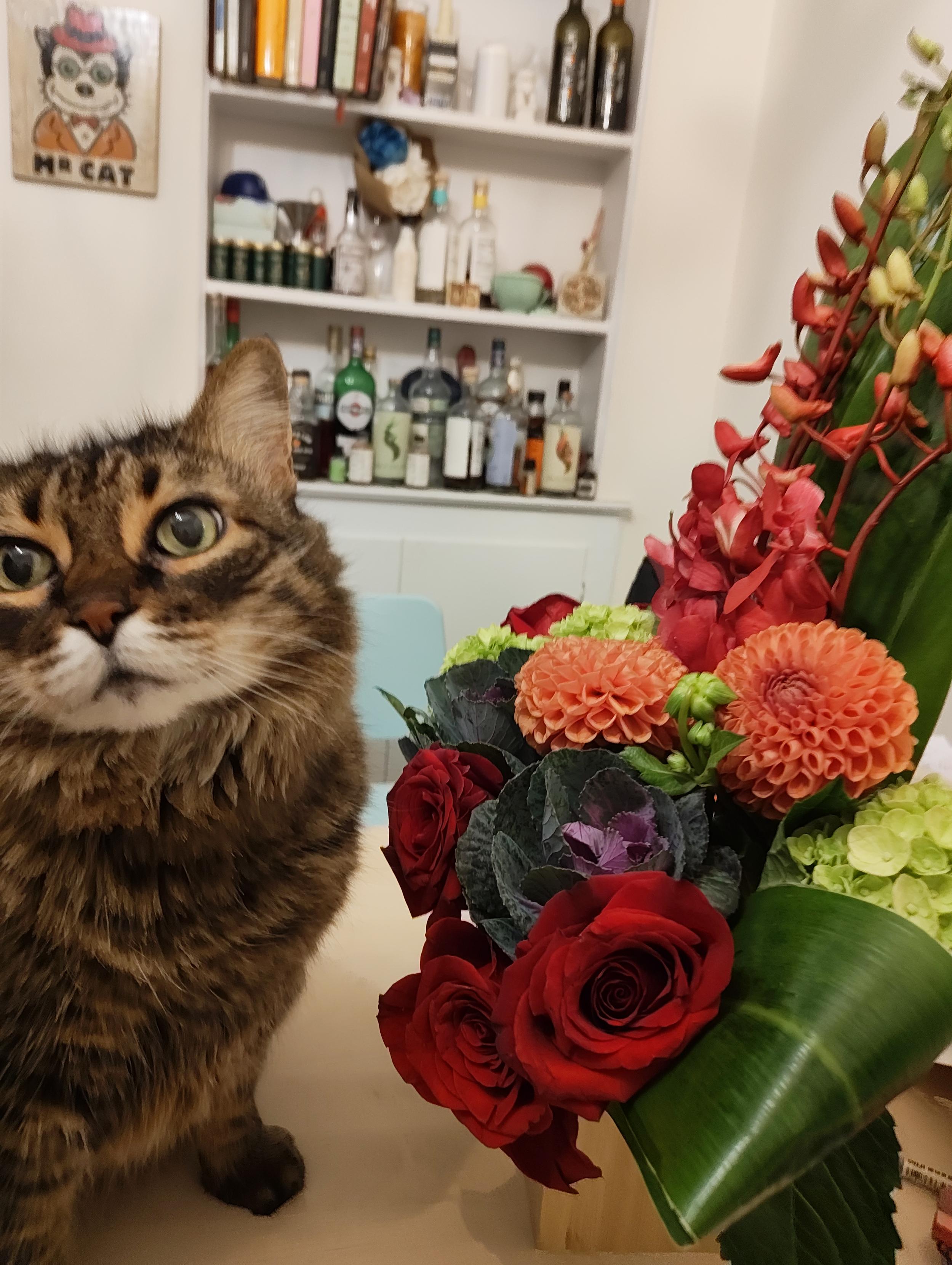 The same tabby cat is looking manically back toward the camera from the flowers with evil/ecstatic intent in her green eyes