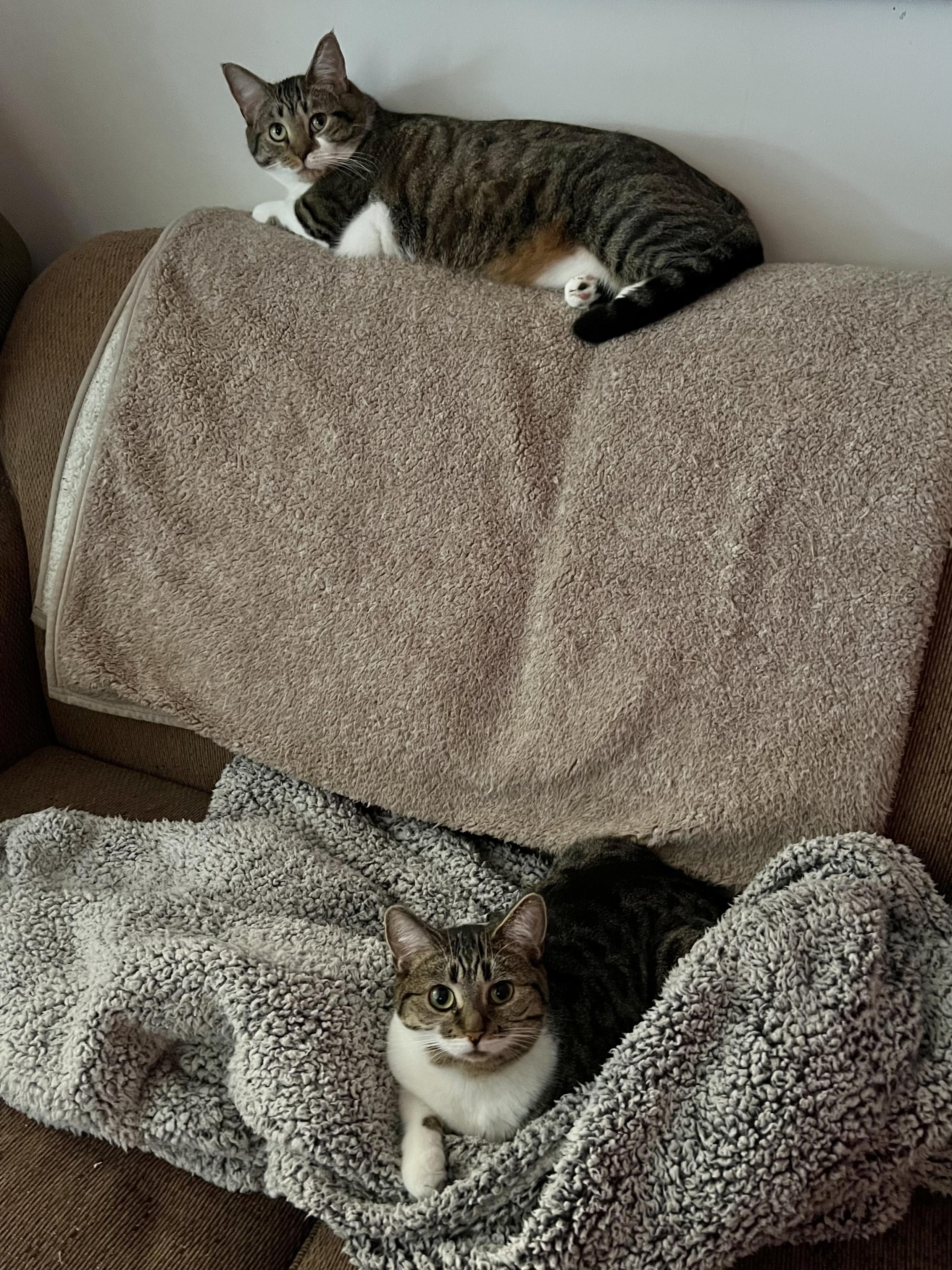Tabby siblings on the couch. Jonesy on the back, Ripley on the cushion.