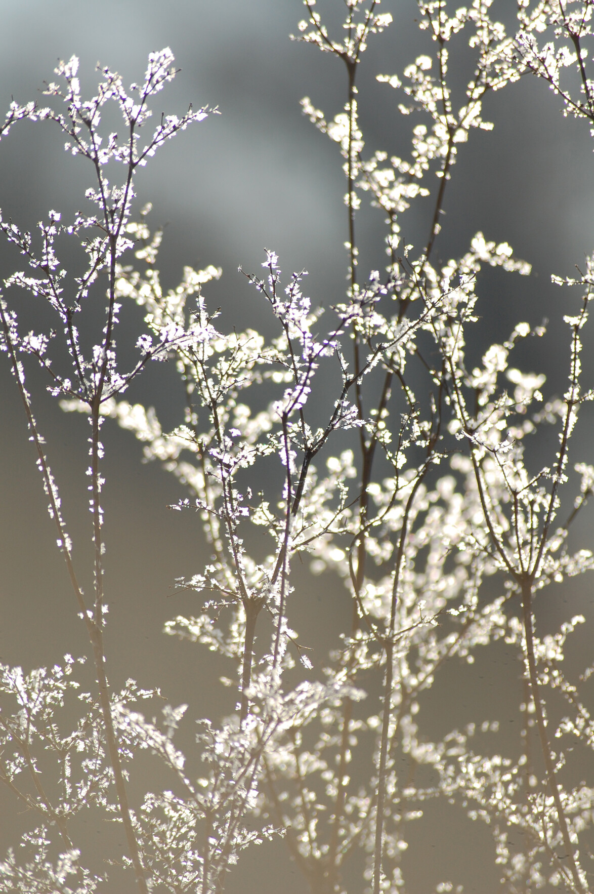 Foto von gefosteten Zweigen eines Strauches, die in der Sonne glitzern.