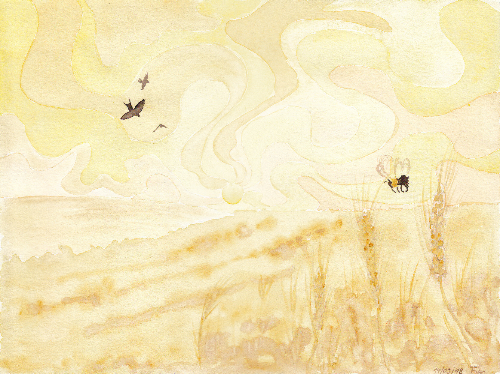 Watercolor painting of fields in yellow. The background shows the shining suns with curvy sun beams. There is a bee and a pair of swallows in the front.