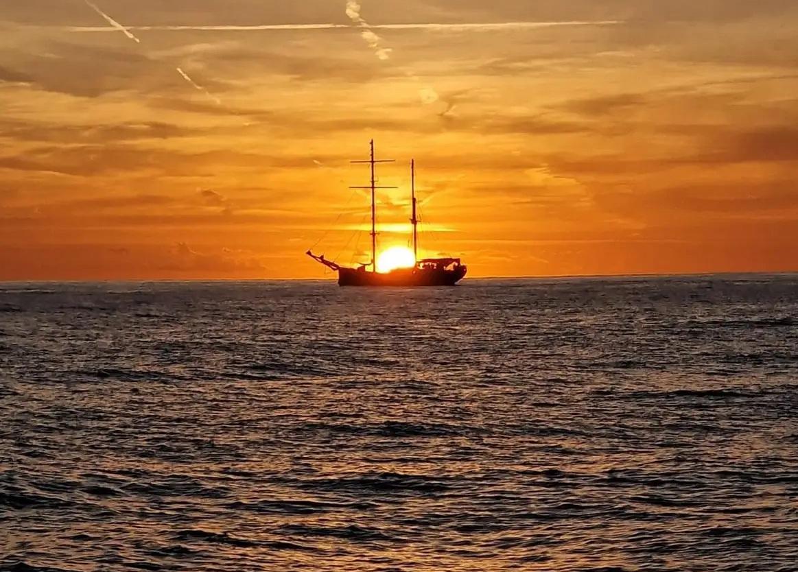 Una barca a vela all'orizzonte mentre si trova allineata con il sole al tramonto