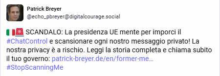 ๐ฎ๐น๐จ SCANDALO: La presidenza UE mente per imporci il #ChatControl e scansionare ogni nostro messaggio privato! La nostra privacy รจ a rischio.