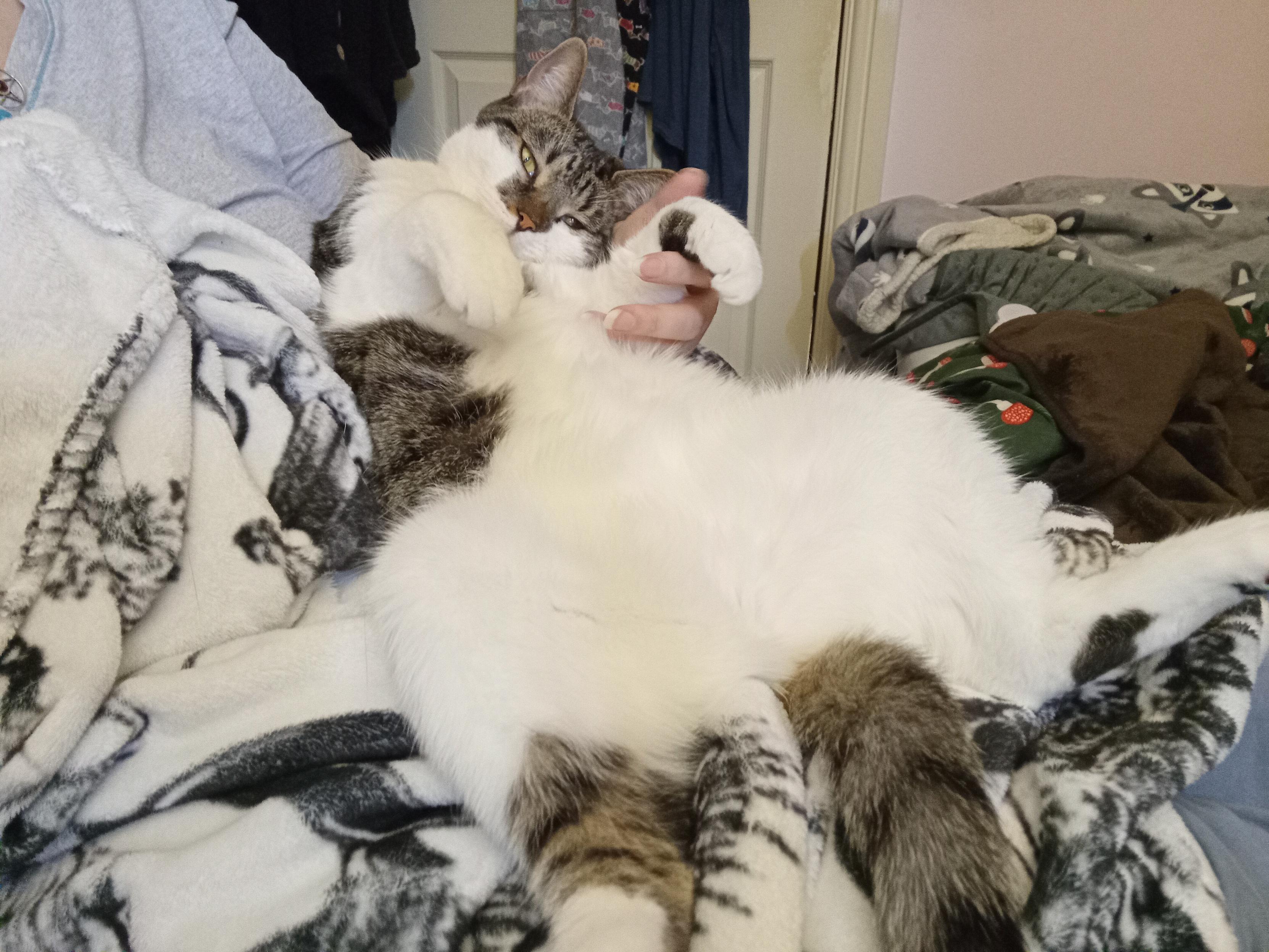 A brown mackeral tabby cat spread out on my lap on her back, her head resting in the crook of my arm, doing the t-rex arm pose.