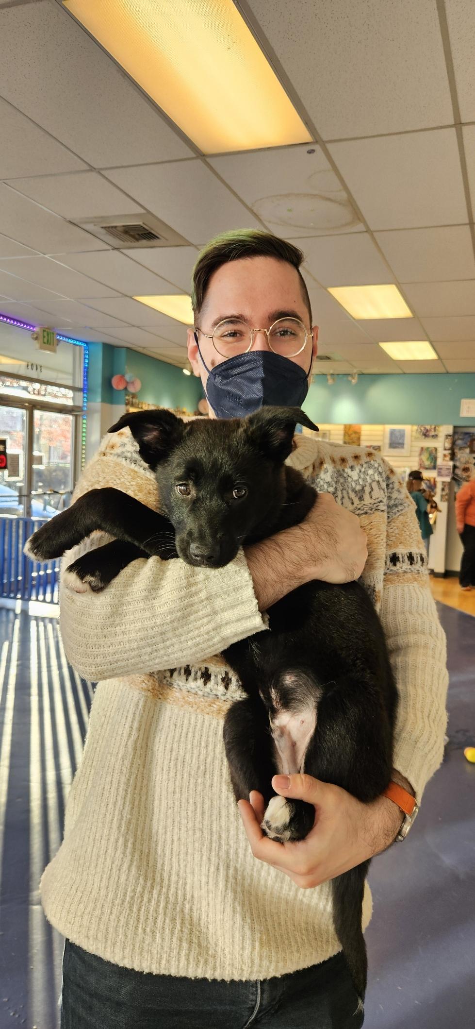 Me, wearing a blue mask, holding a black puppy in my arms. The puppy is very cute.
