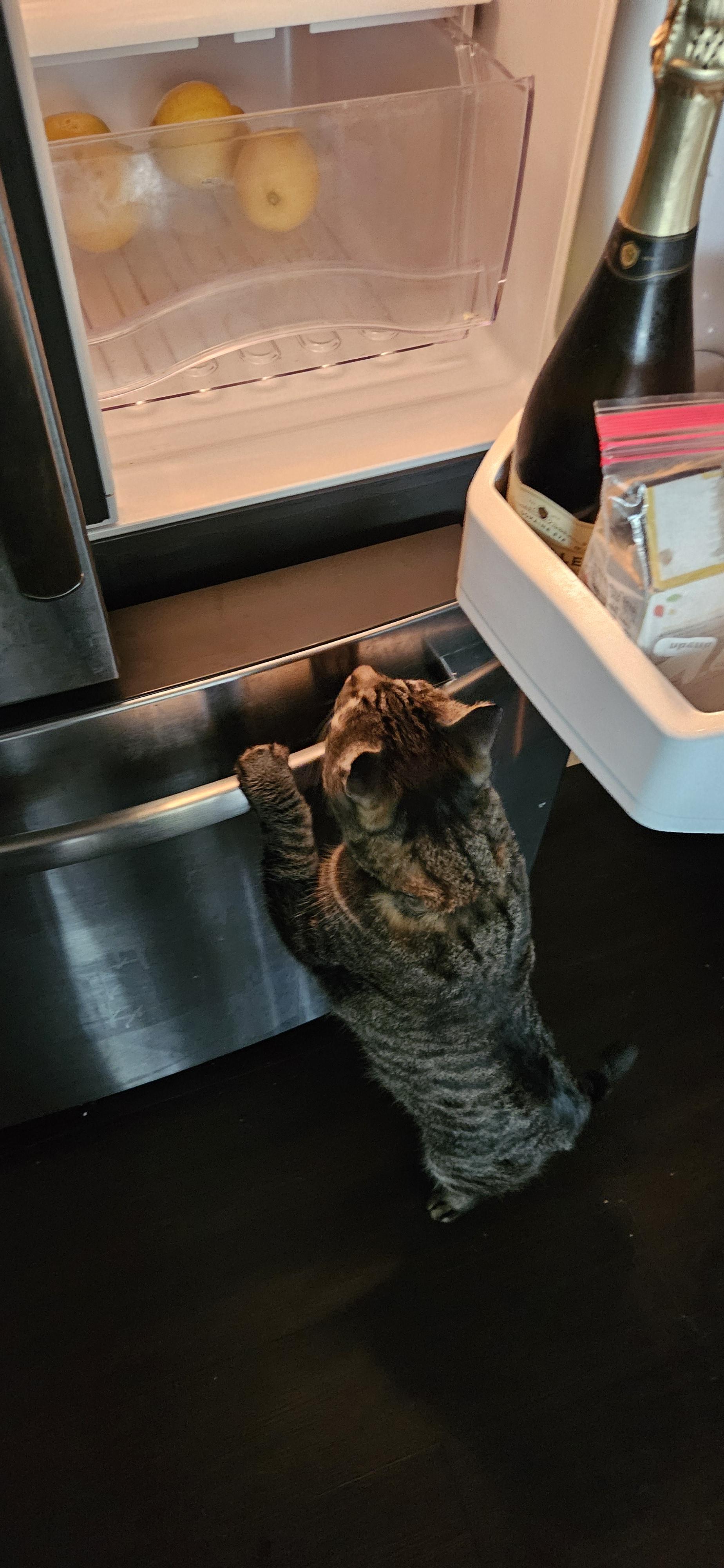 Momo with two paws on the bottom door of my fridge. The right door is open and Momo is looking inside for food. A drawer of lemons is visible in the fridge.