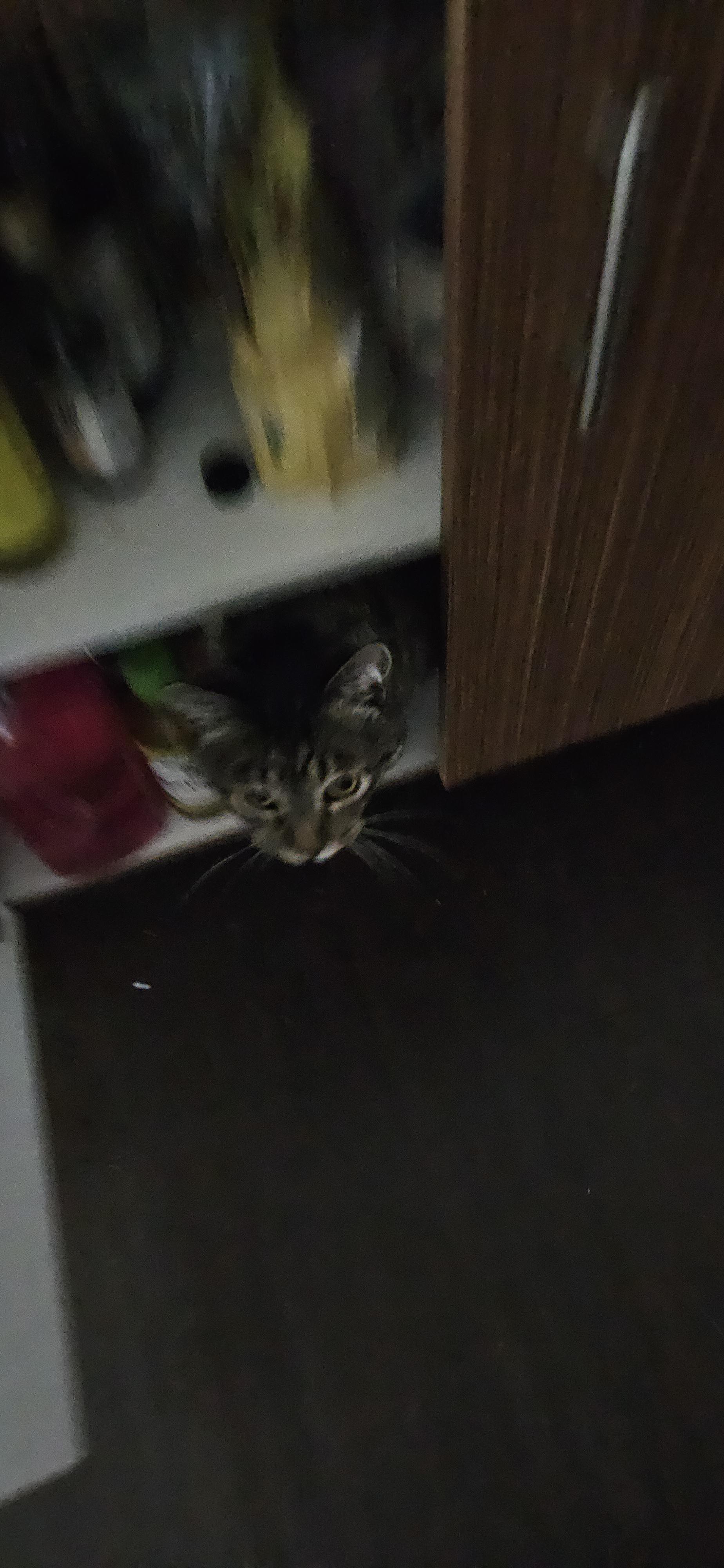 A blurry picture of momo jumping out of another cabinet in my kitchen.