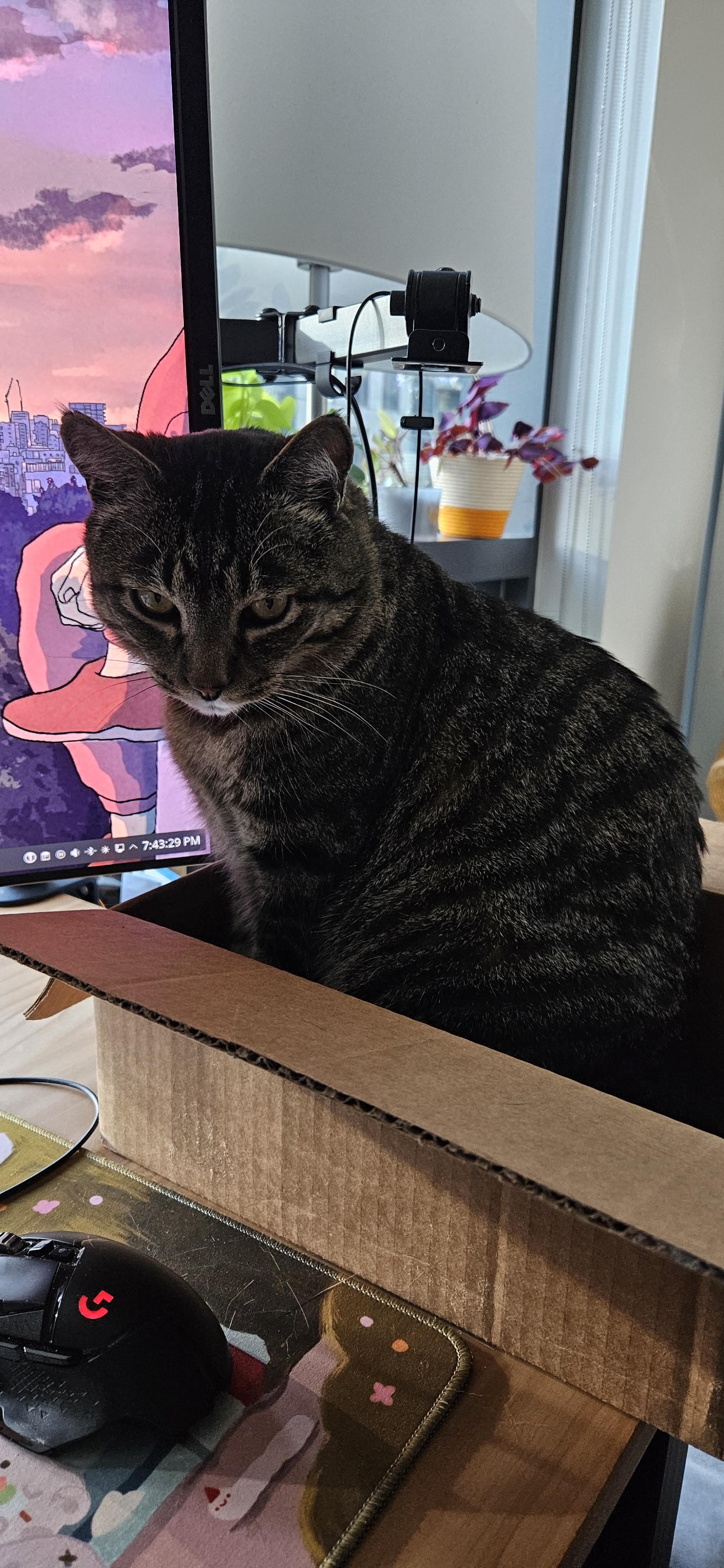 Momo sitting in the box on my desk. He is a grumpy boy.
