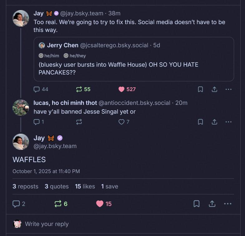 Screenshot of conversation thread and quote on Bluesky. Putting it in chronological order: Jerry Chen posted "(Bluesky user bursts into Waffle House) OH SO YOU HATE PANCAKES??" Jay (CEO of Bluesky corporation) quoted and replied: "Too real. We're going to try to fix this. Social media doesn't have to be this way." Lucas replied to Jay: "Have y'all banned Jesse Singal yet or" Jay replied to Lucas "WAFFLES"