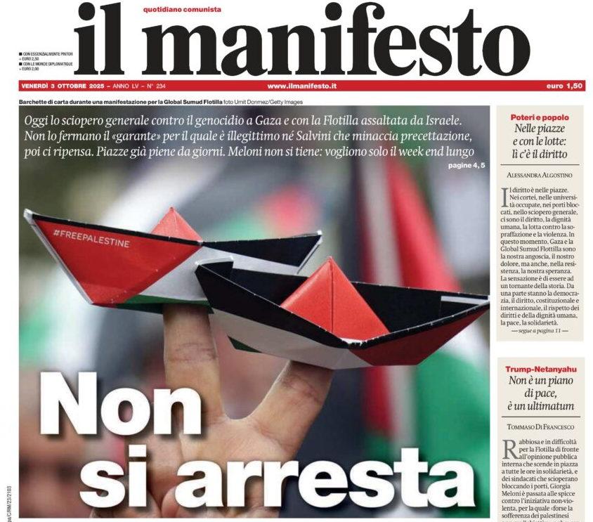 Non si arresta Oggi lo sciopero generale contro il genocidio a Gaza e con la Flotilla assaltata da Israele. Non lo fermano il Β«garanteΒ» per il quale Γ¨ illegittimo nΓ© Salvini che minaccia precettazione, poi ci ripensa. Piazze giΓ piene da giorni. Meloni non si tiene: vogliono solo il week end lungo
