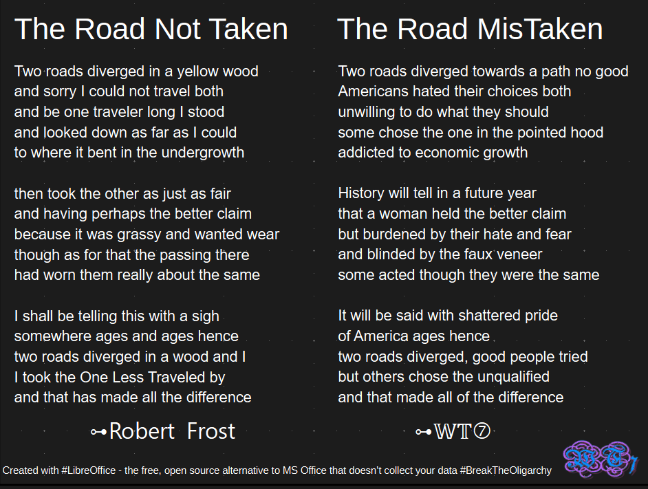 the image contains 2 poems. on the left is the poem The Road Not Taken by Robert Frost. On the right is the poem The Road MisTaken by WT7 Two roads diverged towards a path no good Americans hated their choices both unwilling to do what they should some chose the one in the pointed hood addicted to economic growth History will tell in a future year that a woman held the better claim but burdened by their hate and fear and blinded by the faux veneer some acted though they were the same It will be said with shattered pride of America ages hence two roads diverged, good people tried but others chose the unqualified and that made all of the difference WT7