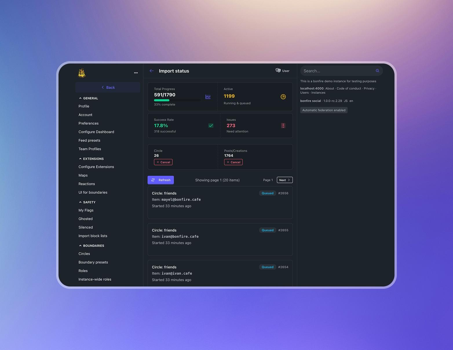 import status dashboard in bonfire, showing details of a migration from another instance