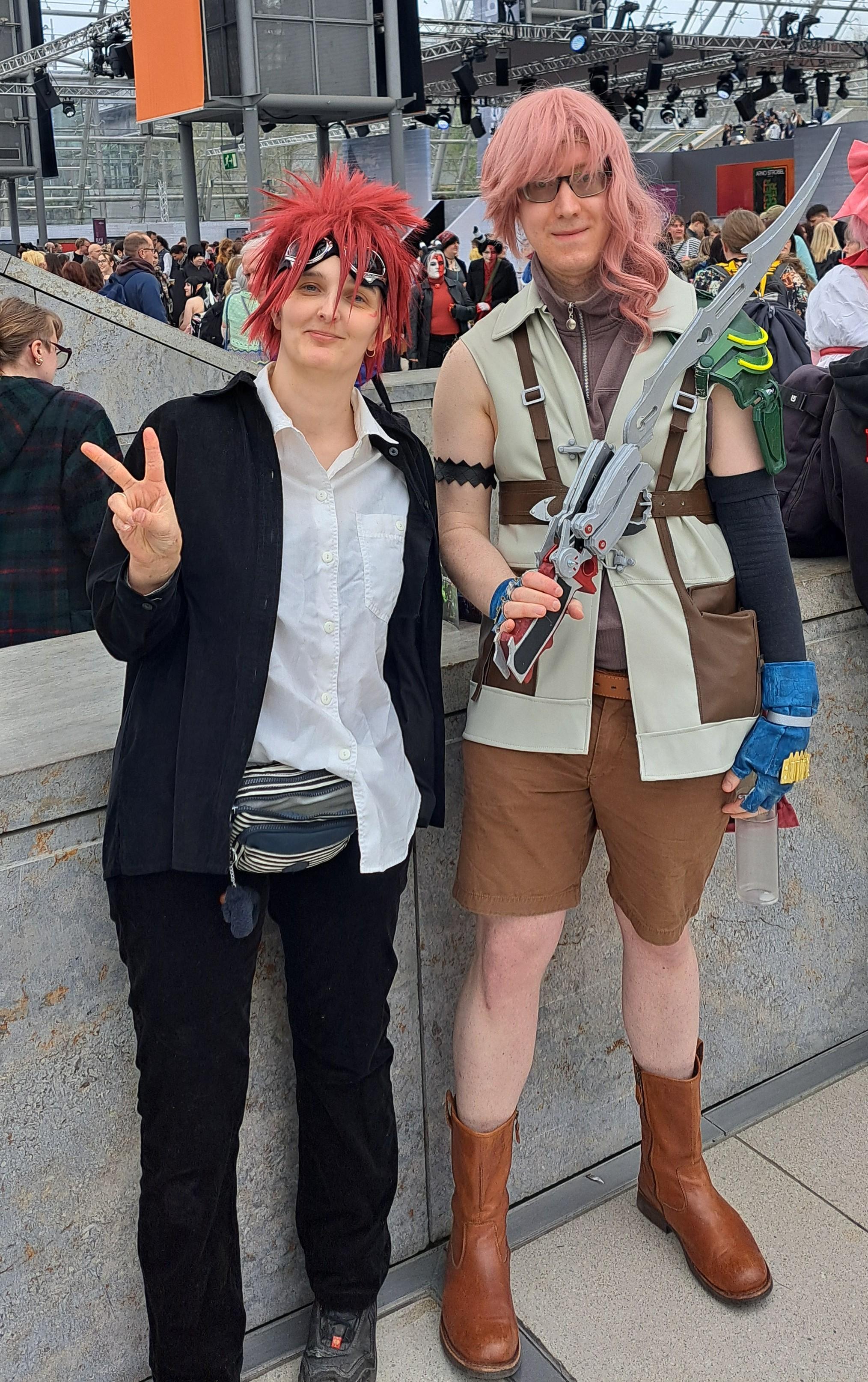 Cosplayers portraying Reno from Final Fantasy VII and Lightning from Final Fantasy XIII in a crowded exhibition hall