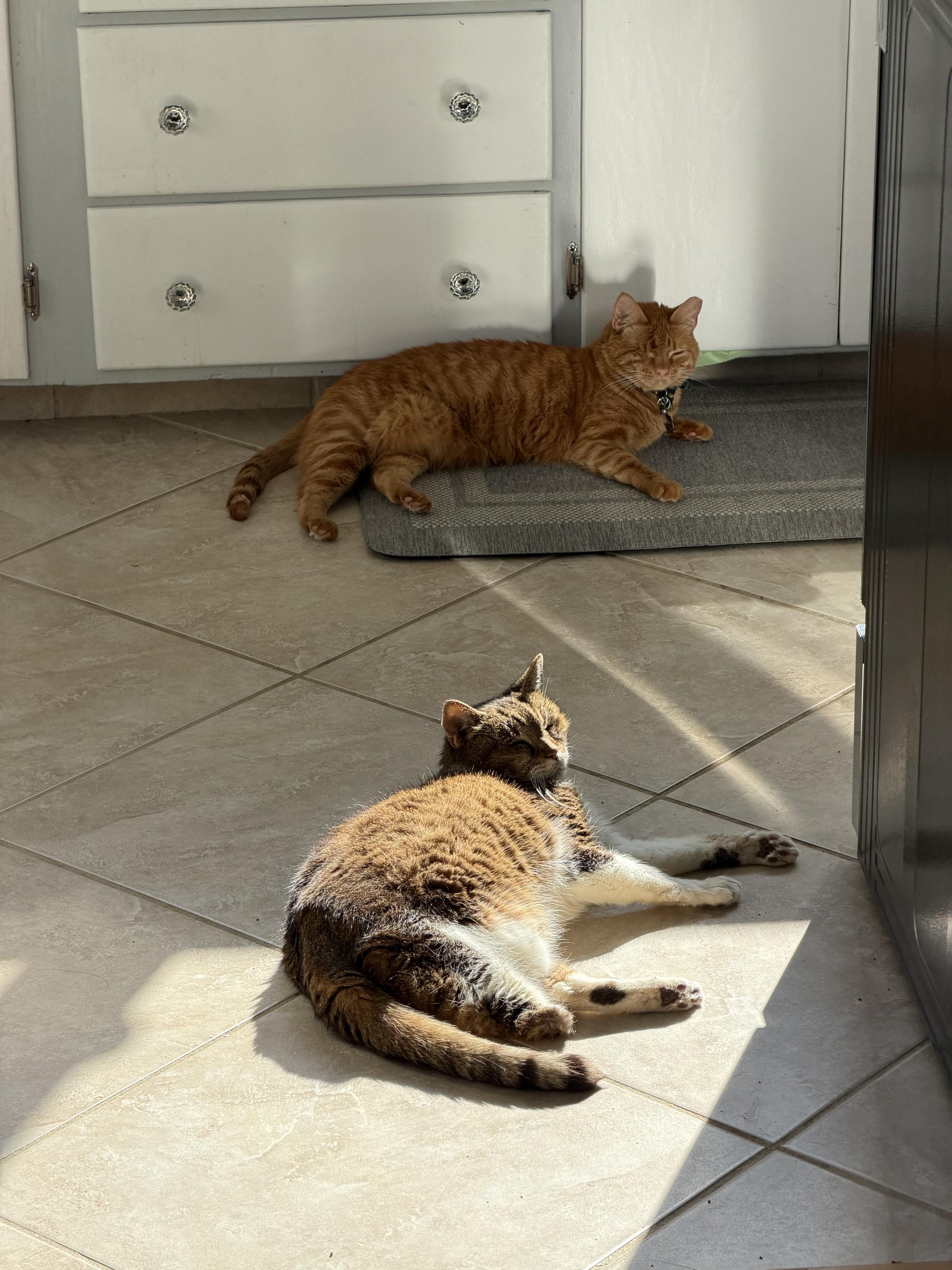 an image of two cats sitting on a kitchen floor. an orange cat with one eye is in the background, laying drowsily on a mat. in the foreground, sitting in a sunbeam, is a three-legged tabby cat with a white belly.