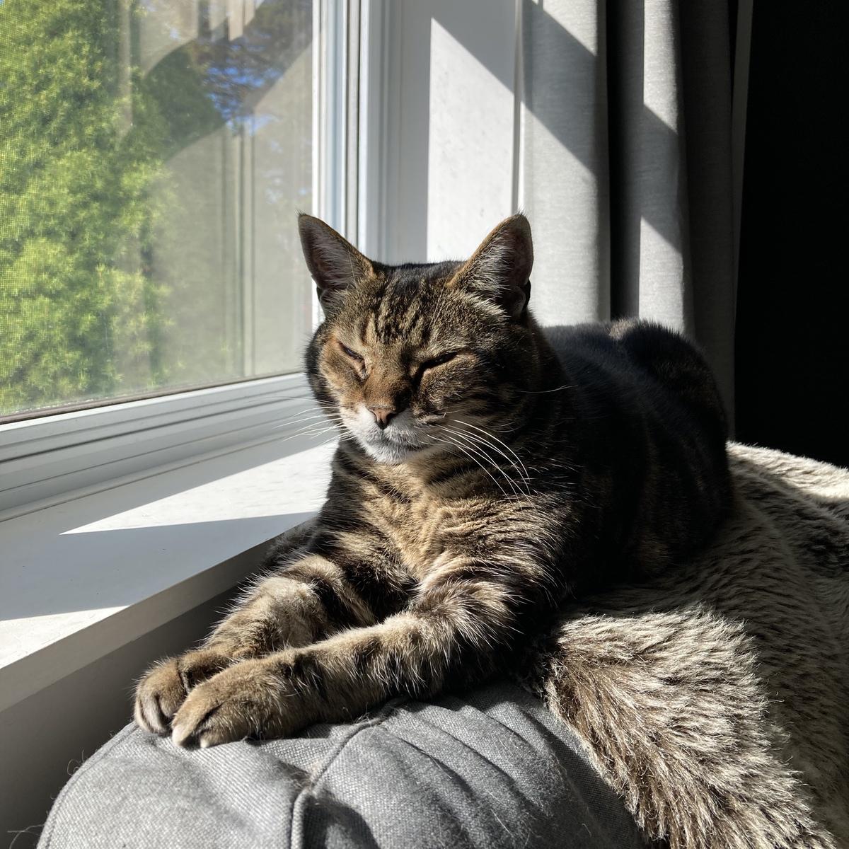Tabby cat lounging on the back of a grey sofa next to a window in the sun. He's partially laying on a taupe faux fur throw. An evergreen tree and bits of blue sky are visible outside the window. He's almost looking at the camera with his eyes half closed.