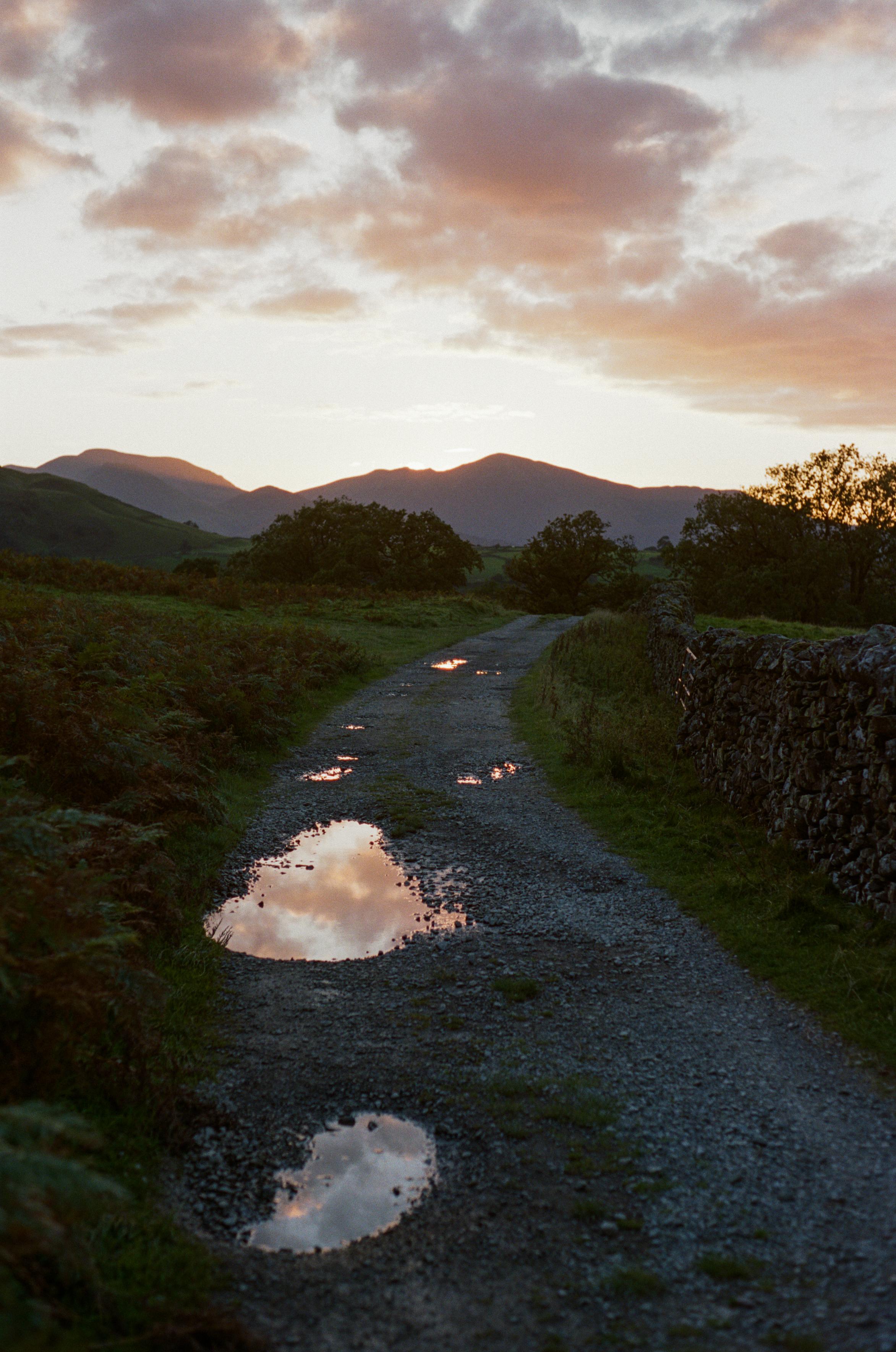 A gravel path next to a dry-stone wall under a pink sky. There are puddles reflecting the sky. In the distance, sun setting behind the fells.