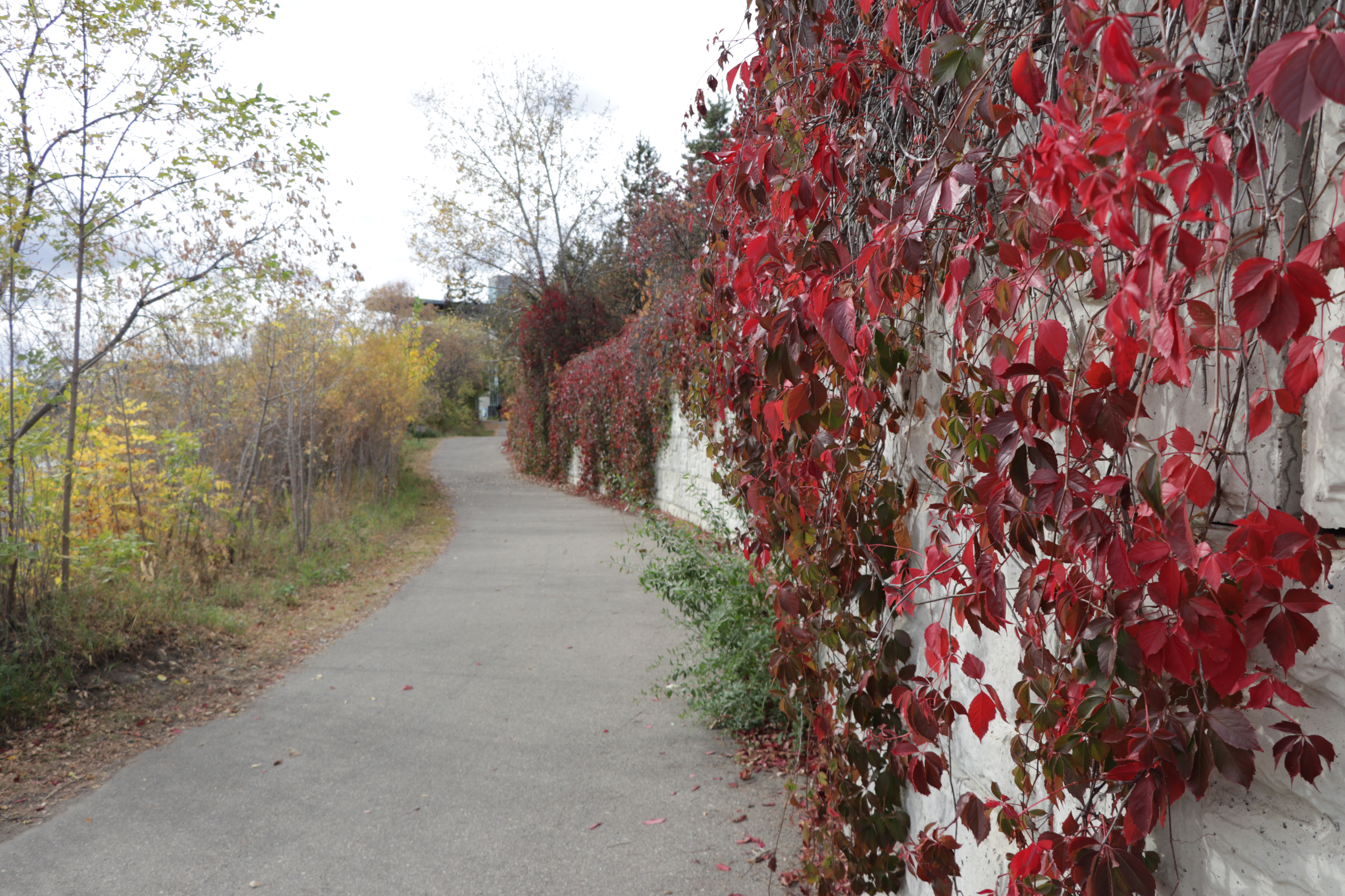 A curvy white wall along a paved path with a bunch of leaves growing over it, up close there are some bright red ones.