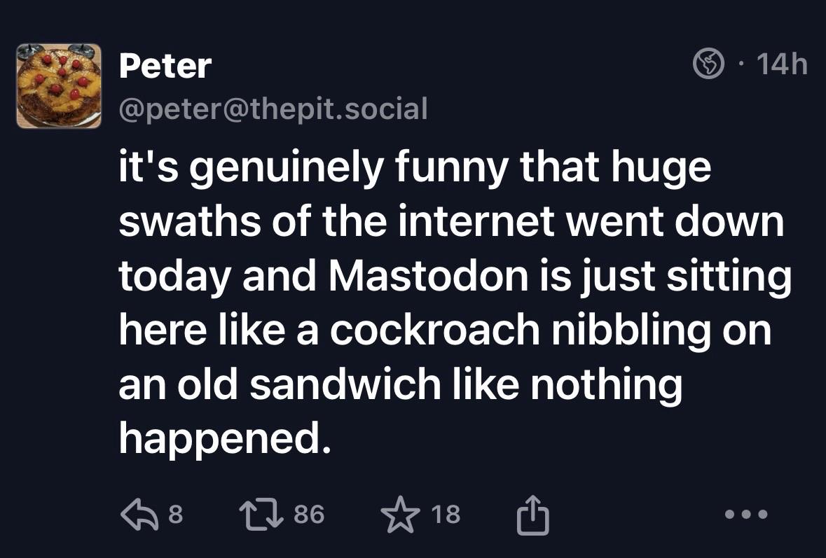 The toot by @peter@thepit.social βit's genuinely funny that huge swaths of the internet went down today and Mastodon is just sitting here like a cockroach nibbling on an old sandwich like nothing happened.β As seen in my Mastifon app and showing 86 boosts and 18 favourites.