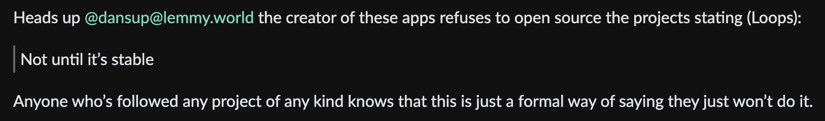Heads up @dansup@lemmy.world the creator of these apps refuses to open source the projects stating (Loops): Not until it's stable Anyone who's followed any project of any kind knows that this is just a formal way of saying they just won't do it.