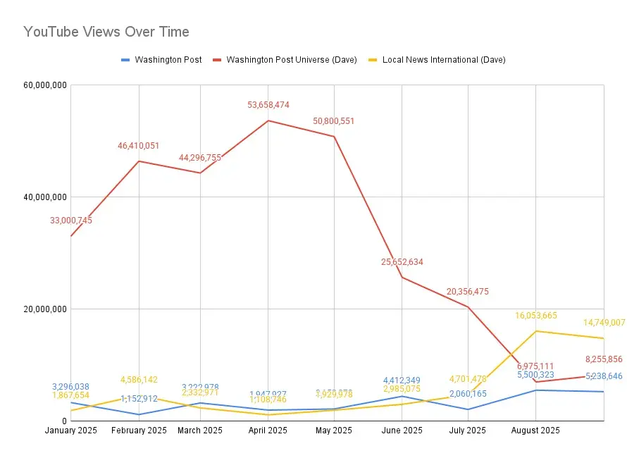 Ad aprile, il Washington Post Universe ha generato quasi 54 milioni di visualizzazioni . A settembre, ne ha raggiunte solo 8,2 milioni , con un calo di circa l'85% , mentre il canale principale del Washington Post non si Γ¨ mosso quasi per niente, supponendo che i dati di RivalIQ siano accurati. Un calo era previsto, ma in questo caso l'entitΓ Γ¨ catastrofica.