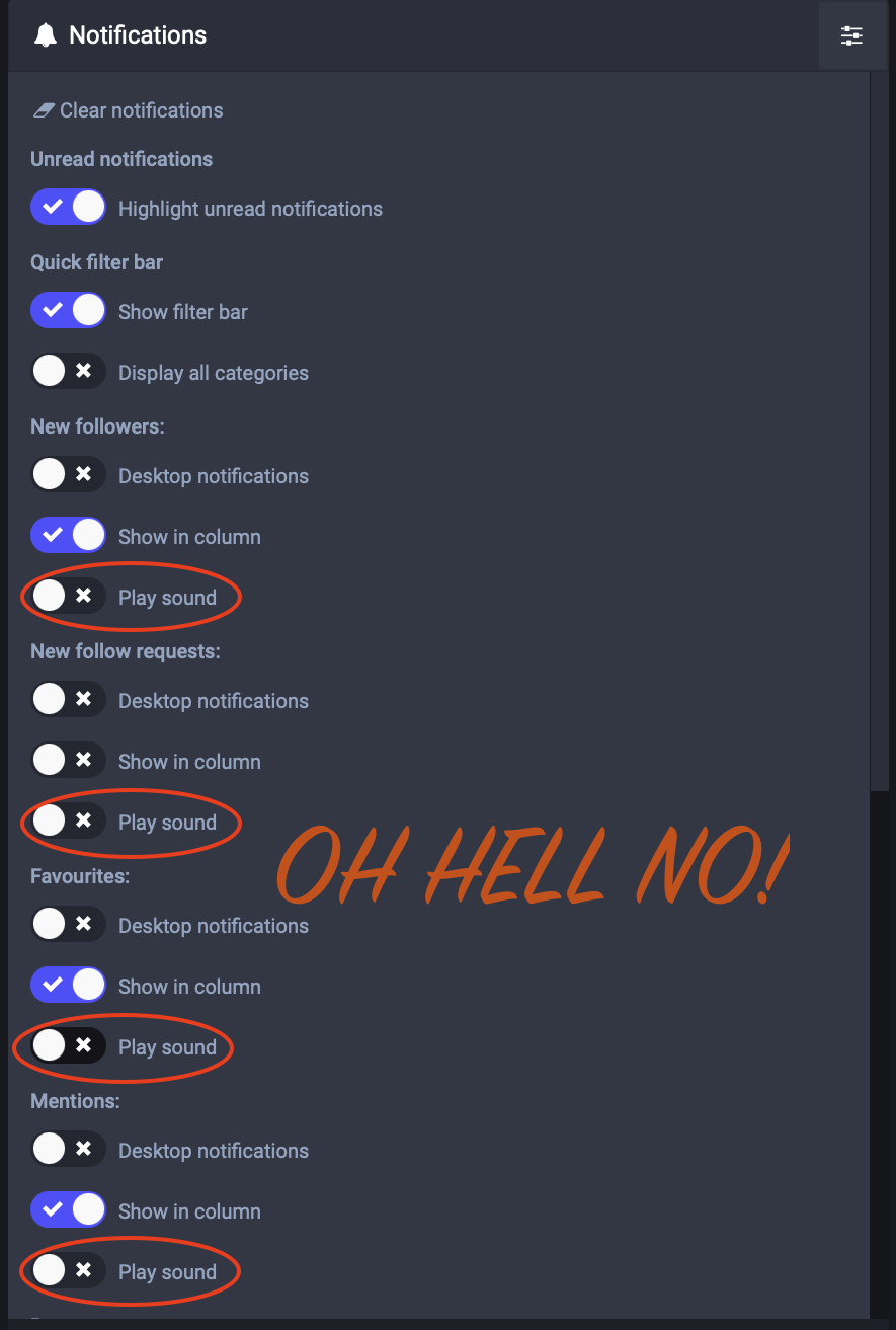 screenshot of mastodon notifications preferences, with four different options to PLAY SOUND, all set to off, and circled in red for visibility for this post An orange caption in all caps reads OH HELL NO!