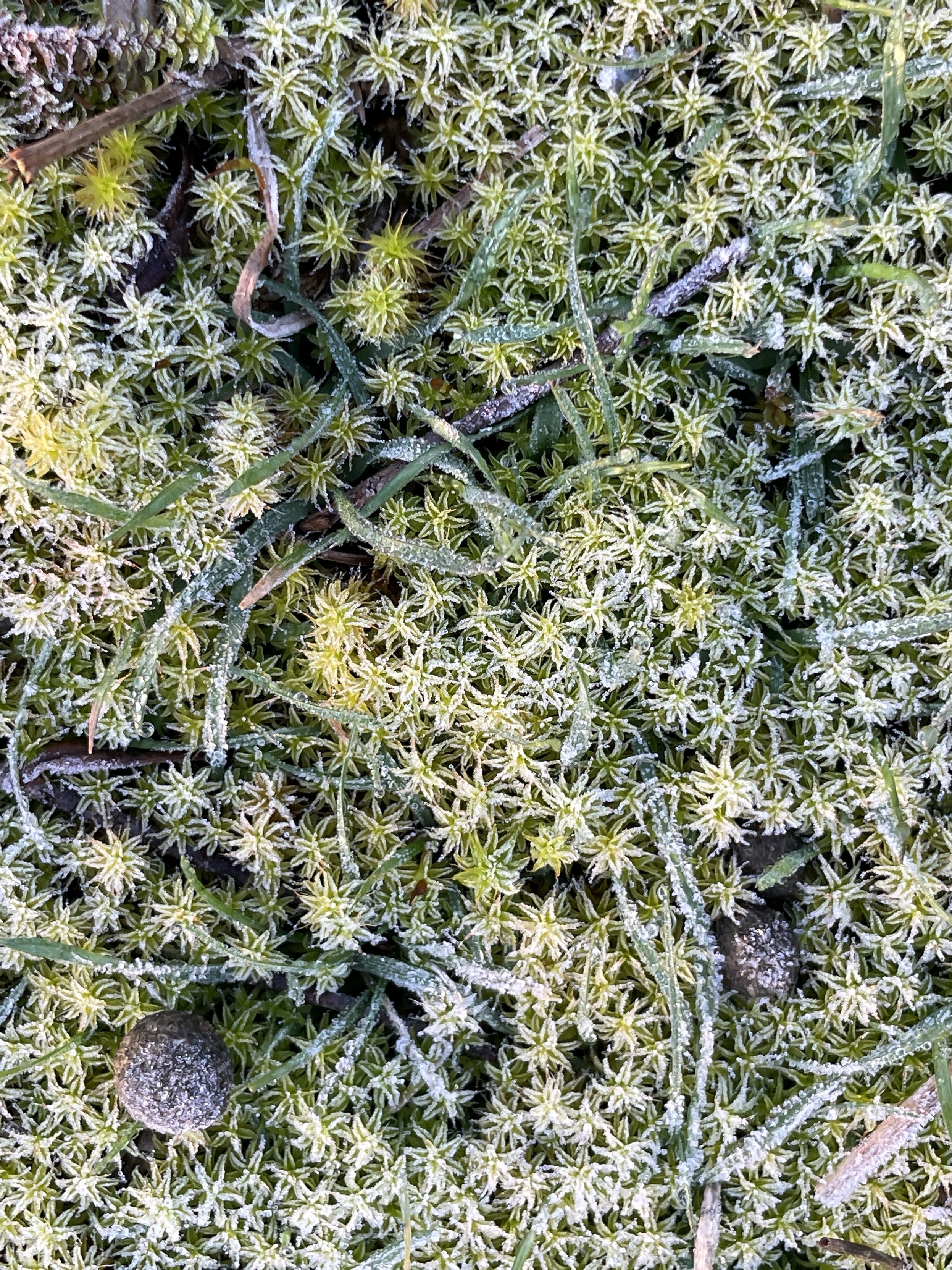 Top-down view of green starry moss thingies with proper frozen dew⦠an also frozen rabbit turdlet lurks in the corner
