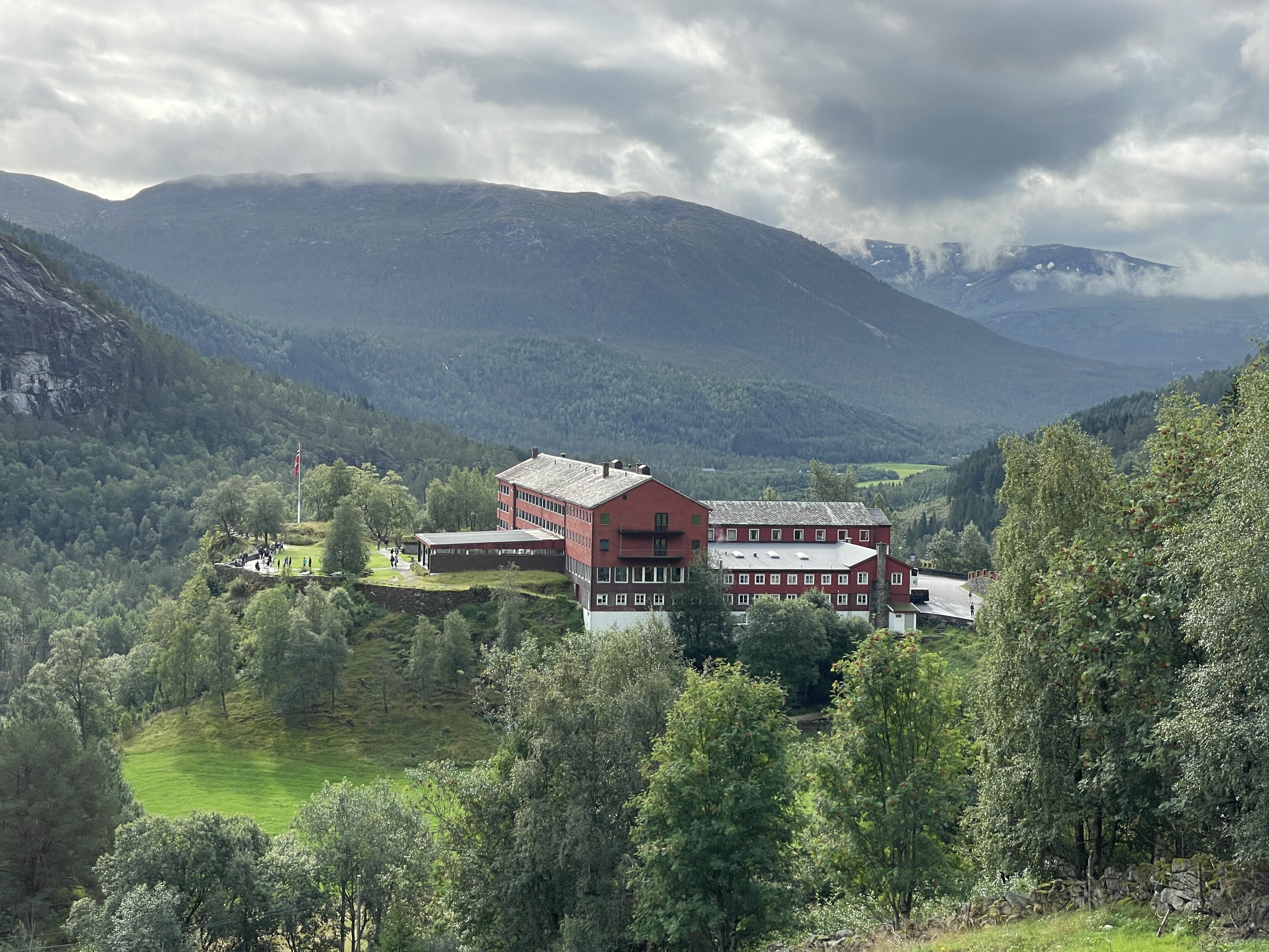 A view of the large red Stalheim hotel on an outlook over the valley, under a foreboding dark overcast sky
