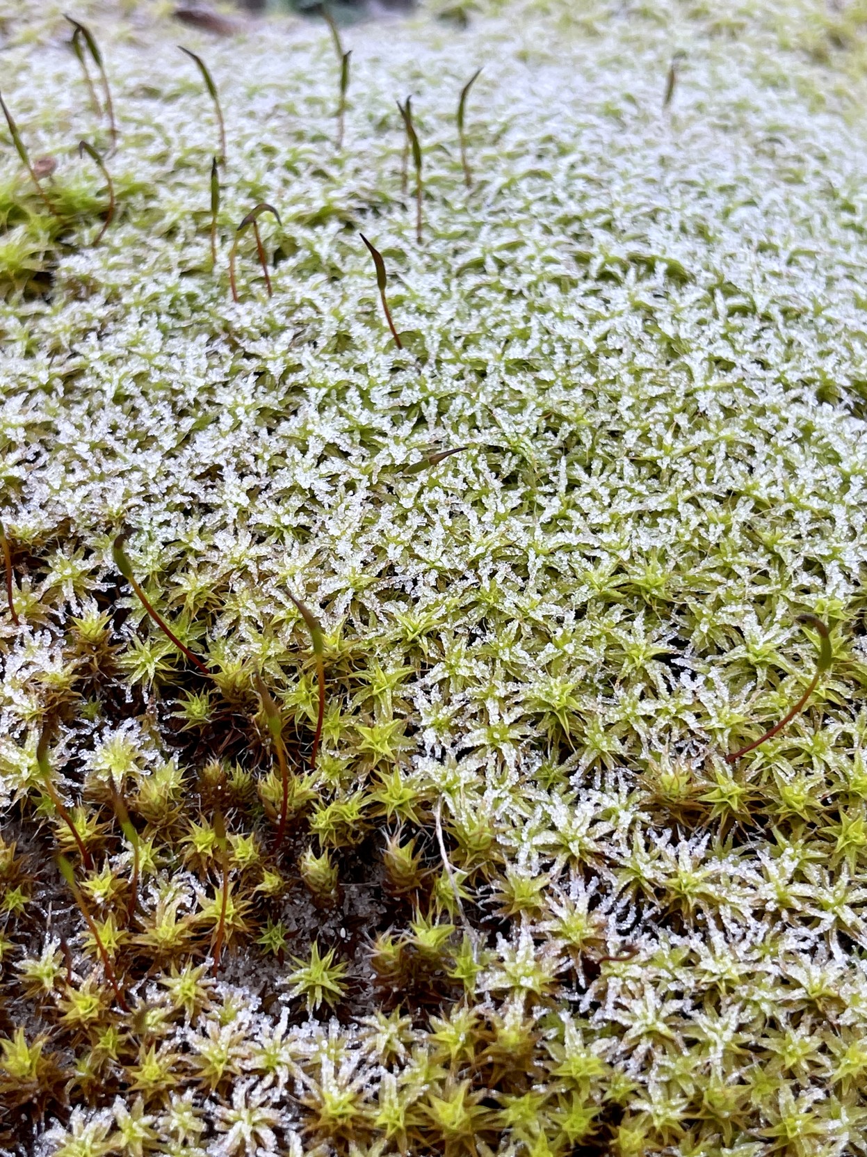 Tiny mossy flowers (close-up) with a layer of morning frost