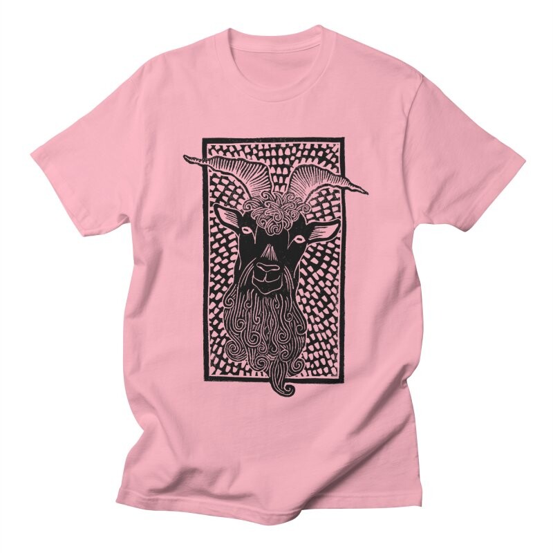 A black goat head print with a scalloped background in a rectangular frame. This image shows it on a men's pink t-shirt