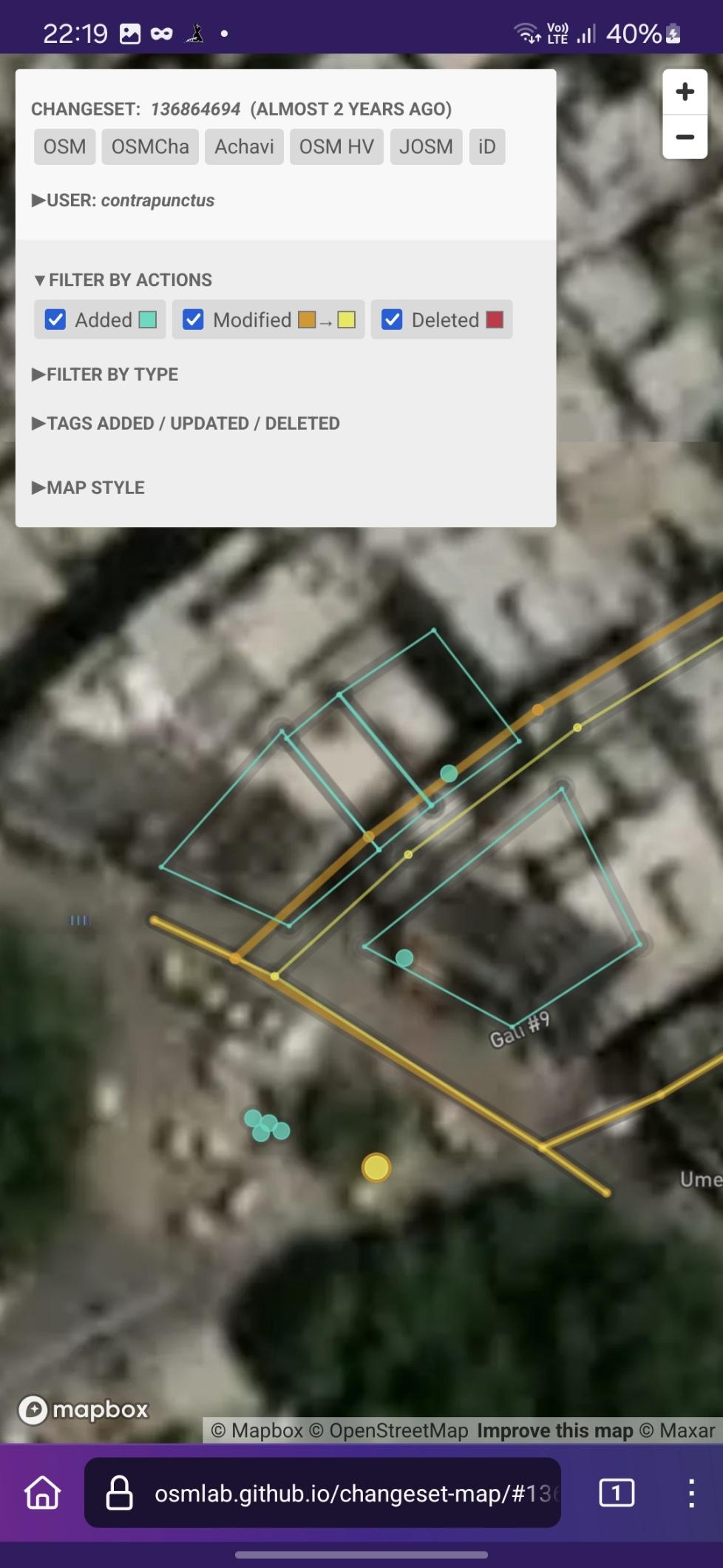 Screenshot of Changeset Map, visualizing the changes made against a satellite imagery background. I've added 4 apartment buildings (represented by blue polygons), in addition to tweaking some streets, and adding 4 surveillance cameras, 2 POIs, and an alternative name for Mohammadi Chowk.